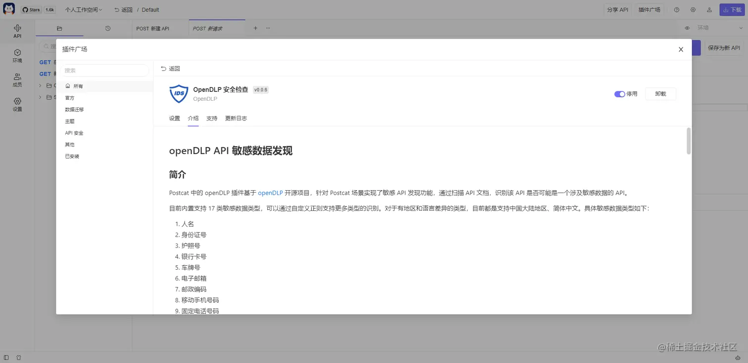 API **安全插件,**我们可以安装 OpenDLP 插件,实现发现敏感 API 字段功能,通过扫描 API 文档,识别该 API 是否可能是一个涉及敏感数据的 API,API 管理更安全: