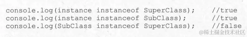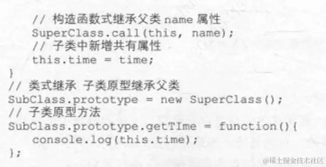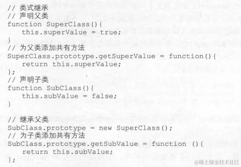 把父类的实例(new SuperClass())赋给子类的原型(SubClass.prototype),即SubClass.prototype继承了