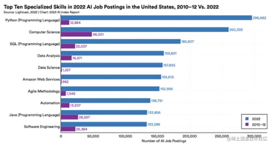 在斯坦福报告中,Python的相对增长与其他所需技能相比脱颖而出,同时绝对增长也很显著: