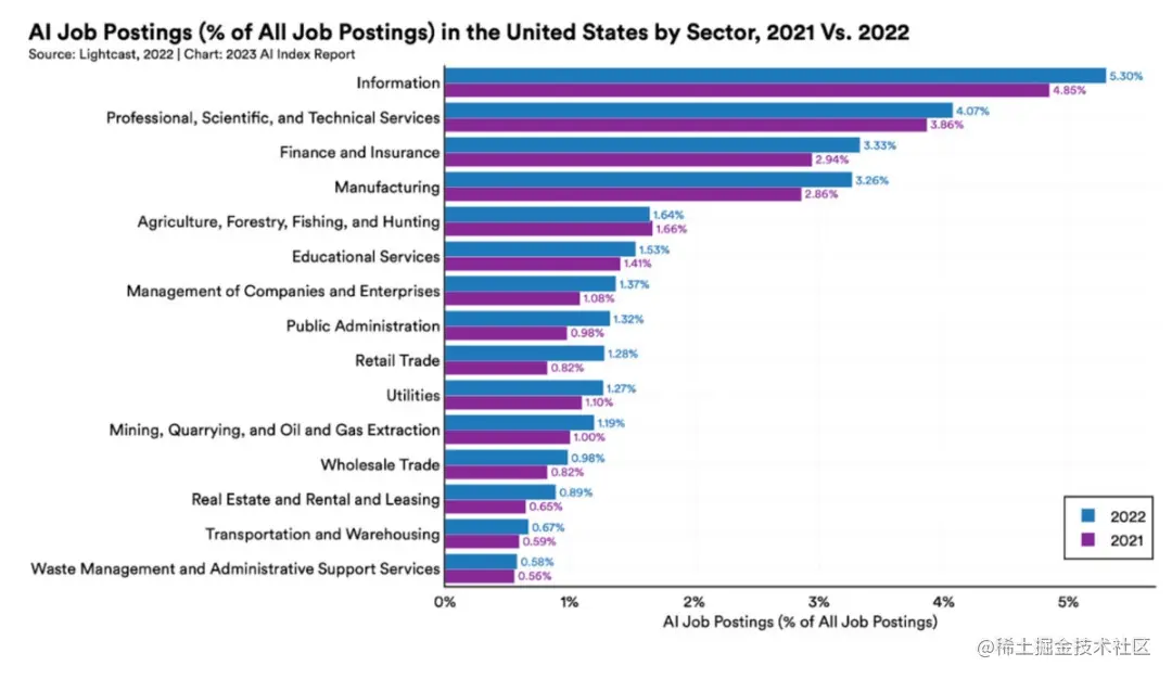 在这样做的过程中,几乎所有美国产业部门对AI/ML人才的需求都有所增长。平均而言,与AI/ML相关的职位招聘广告数量从2021年的1.7% 增加到2022年的1.9% 。这个数字看起来可能很小,但这些百分比是所有美国职位招聘的百分比。接近2%的数字相当庞大,尤其是考虑到对大多数企业来说,AI/ML技术仍然没有得到充分证明。正如我之前提到的,有些行业发布要求AI/ML专业知识的职位招聘广告的比例要高得多。