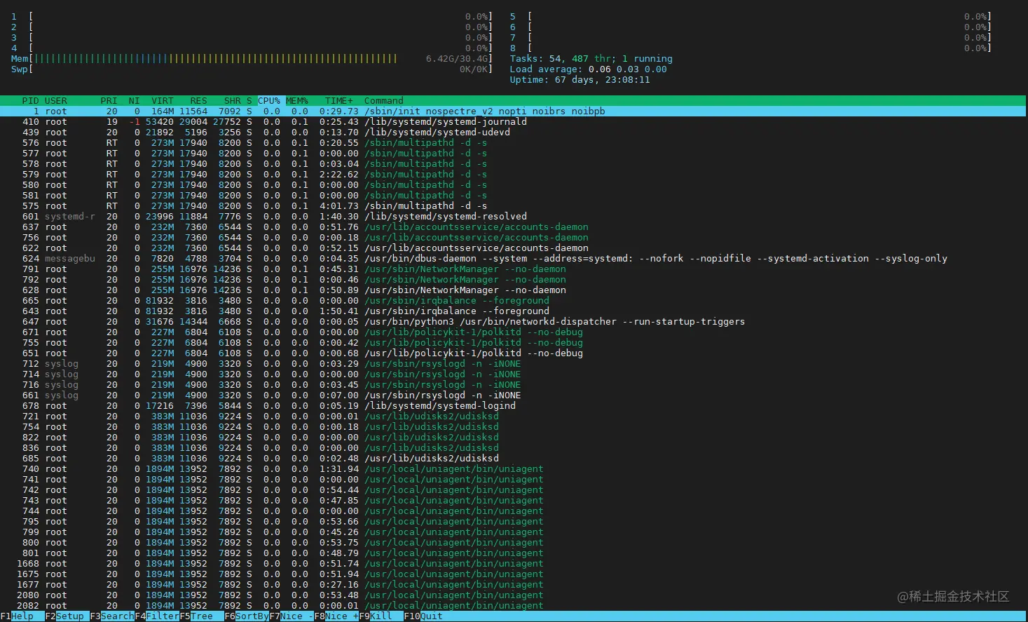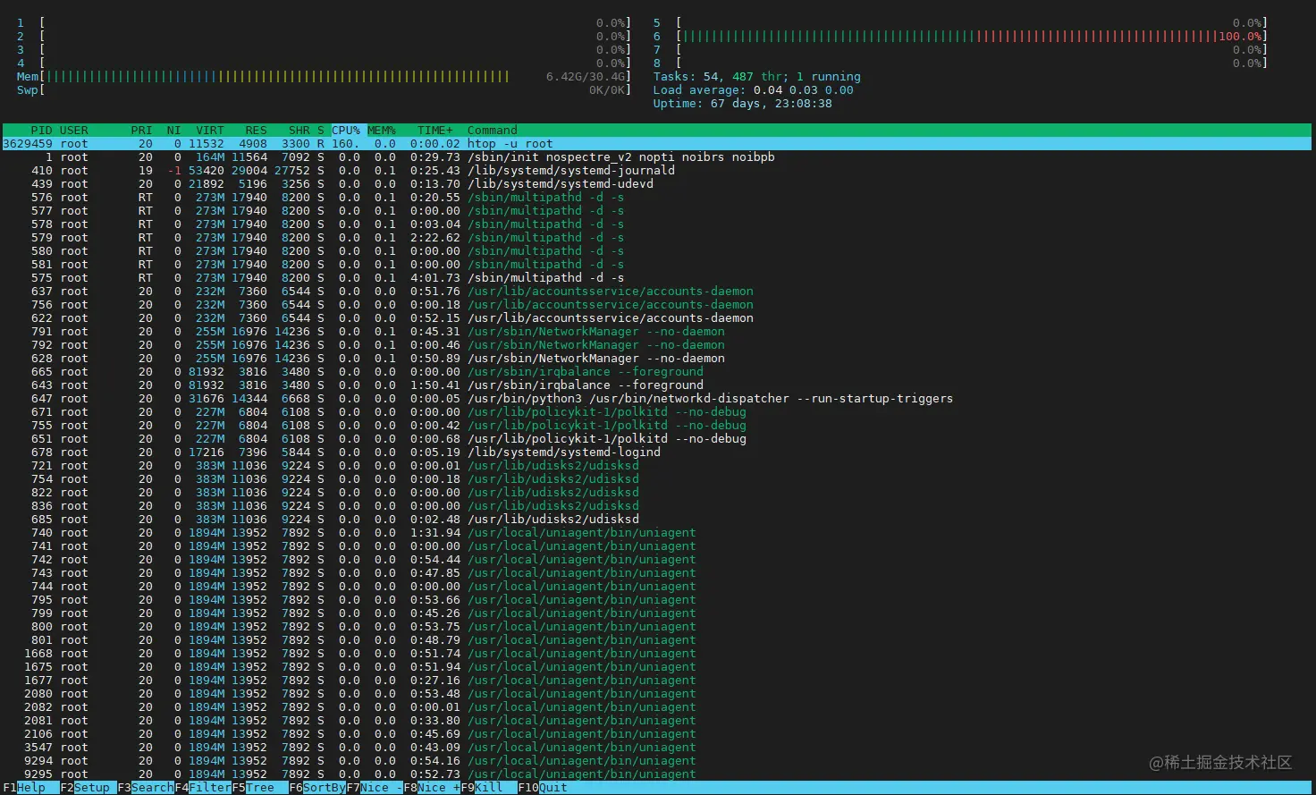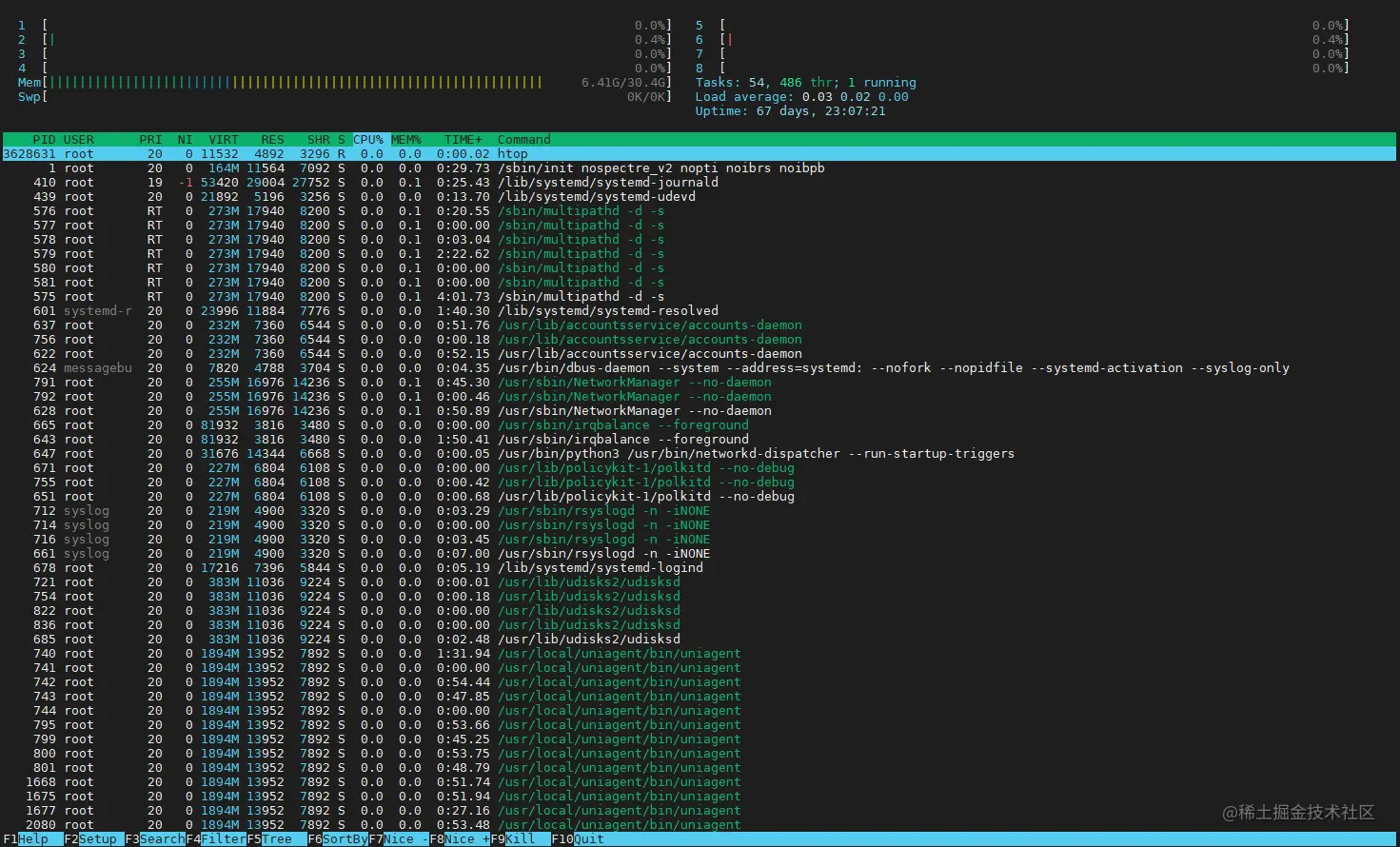 htop命令是top命令的增强版,它提供了更多的功能和更友好的界面。以下是htop命令的一些示例: