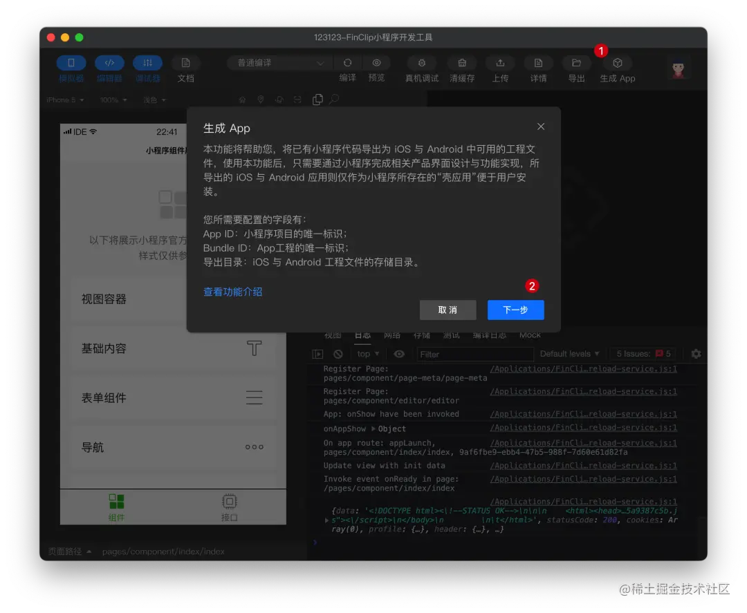 FinClip IDE 的亮点是,它支持**「「小程序一键转换成 APP」」**,可以将已有小程序代码导出为 IOS 与 Android 中可用的工程文件,由于导出的工程文件已经集成了 FinClip SDK ,所以所生成的APP直接拥有小程序的运行能力,后续可在这个 APP 上继续上架更多小程序,自建自己的小程序生态。