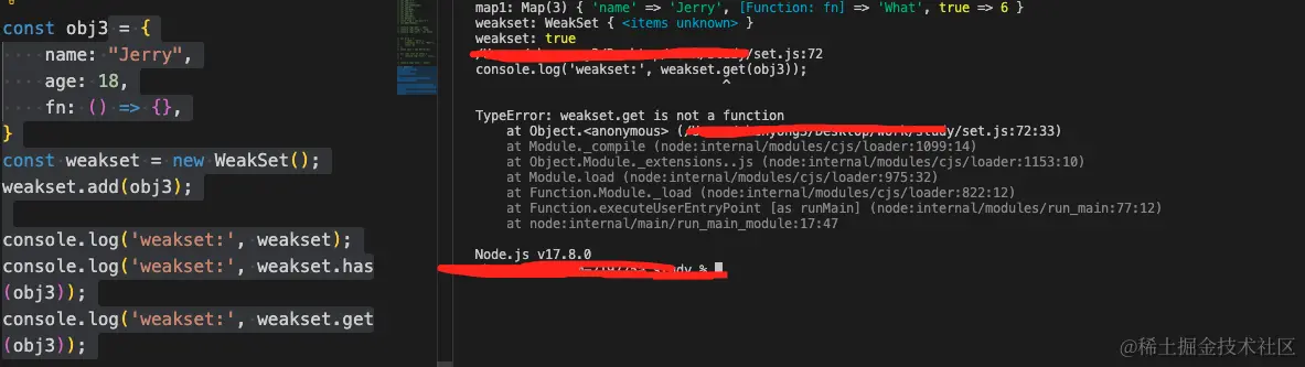 b. WeakMap不可迭代,但可以使用map.set()、map.has()、map.delete()方法,但没有get方法