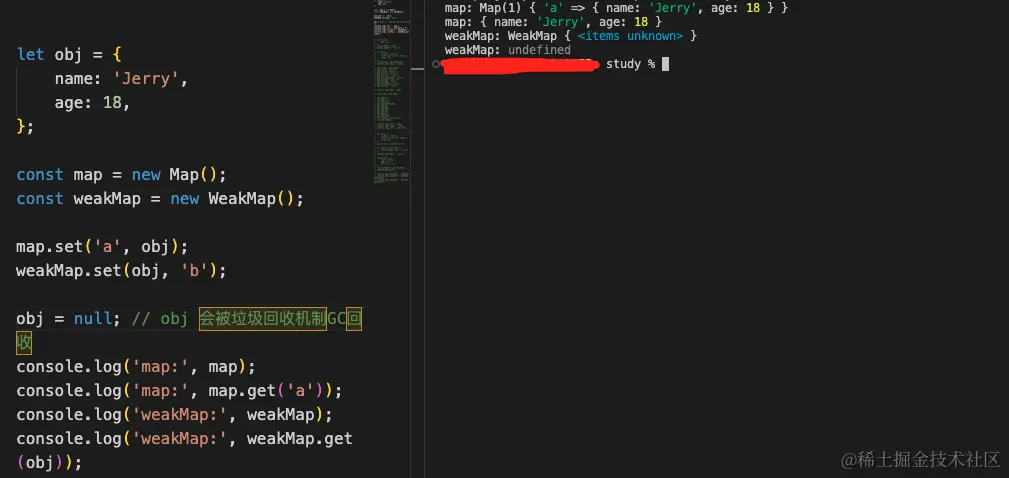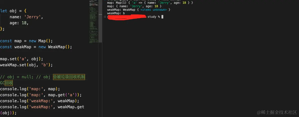 上图可知,当obj被GC回收后,Map将继续保持引用,但WeakMap却造成了数据丢失。