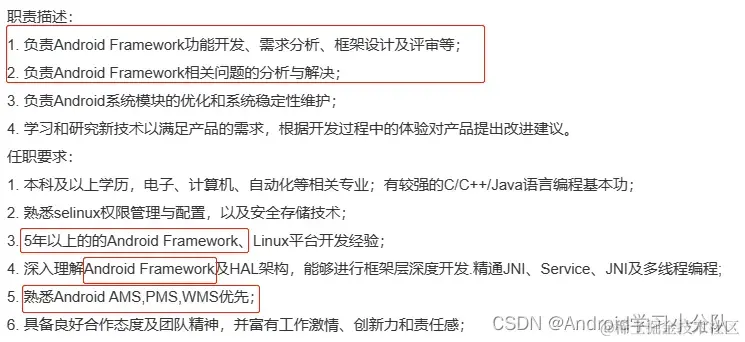 - 学好Framework本身就是有价值的。很多公司的应用开发需要基于模块化、层次化、组件化、控件化来设计架构,它的基础就是建立在Android Framework框架的底层原理之上,学习Framework可以深层次的去解决安卓应用开发时遇到的一些难题,甚至不少公司都有设置专门的Android Framework开发岗位。