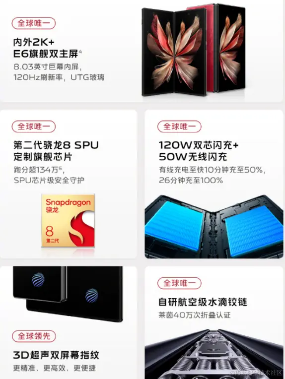 vivo X Fold2还具备第二代骁龙8 SPU定制旗舰芯片,跑分超134万,做到了和旗舰直板机一样的水平,充电上也和快充手机保持一致水平,不仅有120W有线双芯闪充,也有50W无线闪充,真正做到了折叠旗舰该有的水准。