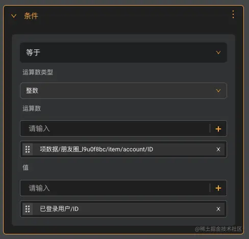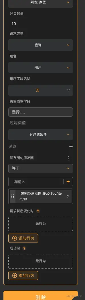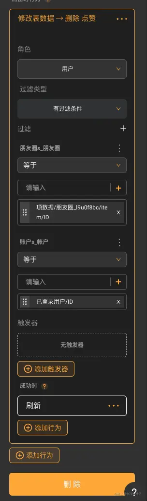 能显示删除的条件如上图,你要保证这条朋友圈的用户id等于在屏幕前操作的已登陆用户的id,然后你才能点击删除,删除行为选择修改表数据删除朋友圈