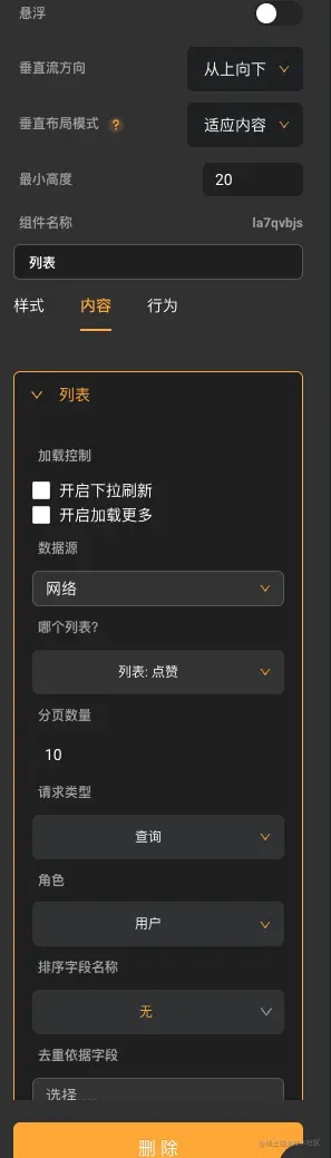 这里面就是要显示这一条朋友圈的点赞,那么就是过滤条件想上图那样配置,让外键等于项数据这一项朋友圈的id,至于为什么取消加载控制,这里是因为我已经在垂直布局模式里选择了适应内容,就是有多少项就显示多少项