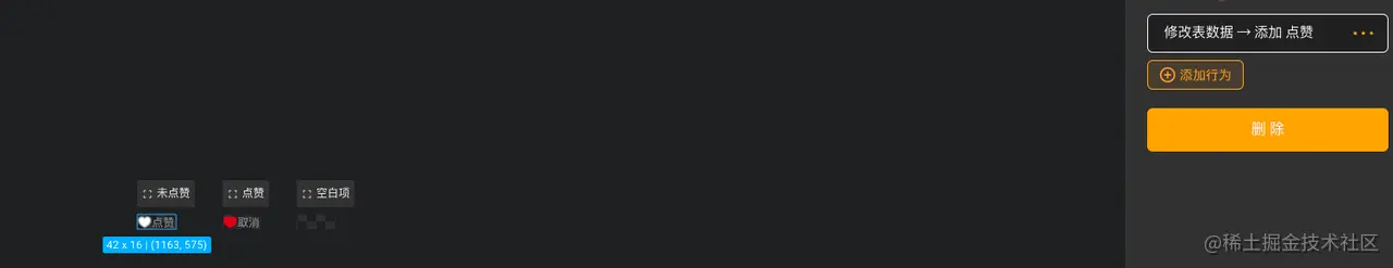 点赞的人名能显示了,然后是取消点赞的行为关系到我们点赞人名的消失,这边在点赞行为里选择修改表数据删除点赞