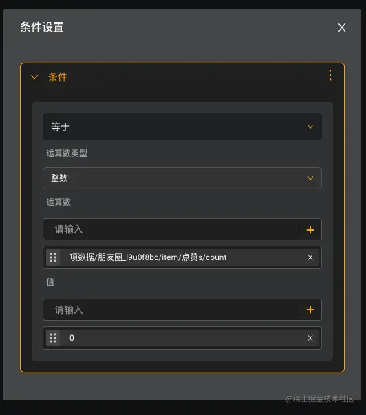 那另一个点赞的呈现条件就是总是了,一般不用管,但是两者的顺序不能乱,一定要未点赞在前,已点赞在后,这是在你看不见的地方代码执行的顺序,不然就是永远显示已经点赞,不符合期待,做到这一步,你的点赞场景成功了一半还有需要显示点赞人的用户名,我们已经设置了一张点赞表用来存放用户名了,那我们就要去在点击未点赞这一项的时候去修改记录我们点赞表的数据
