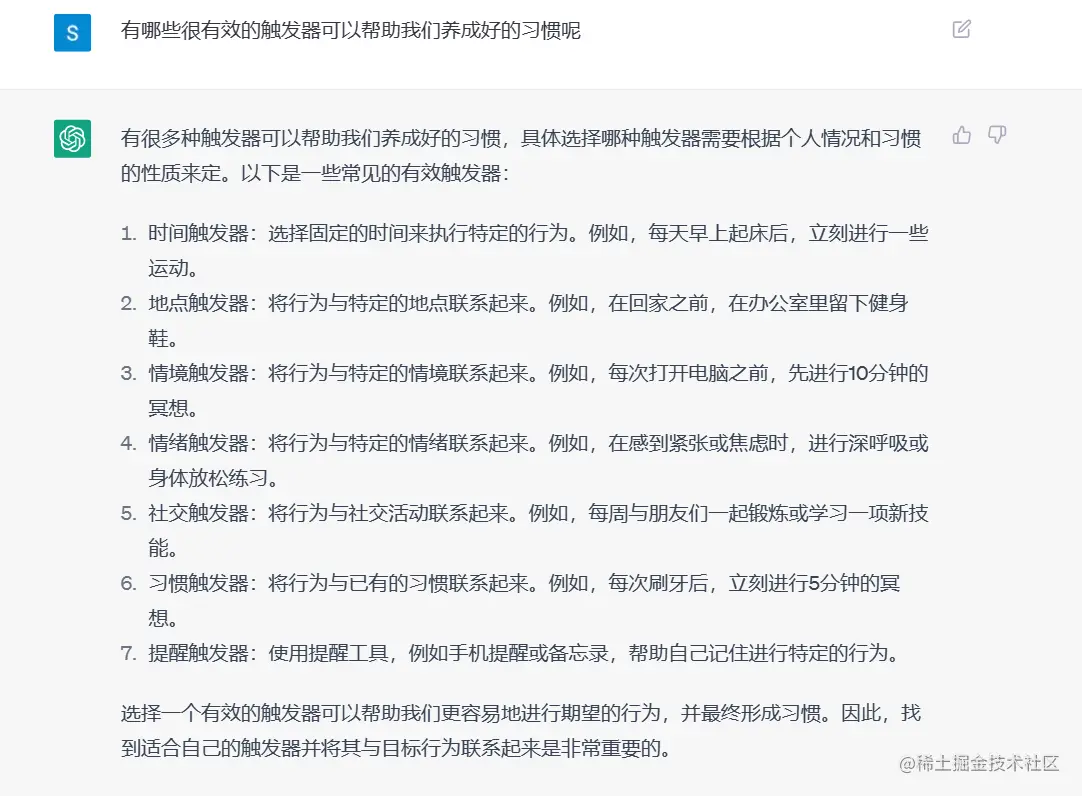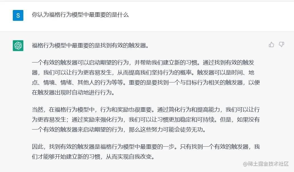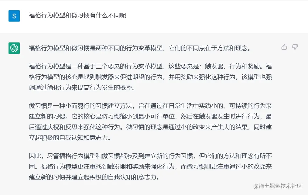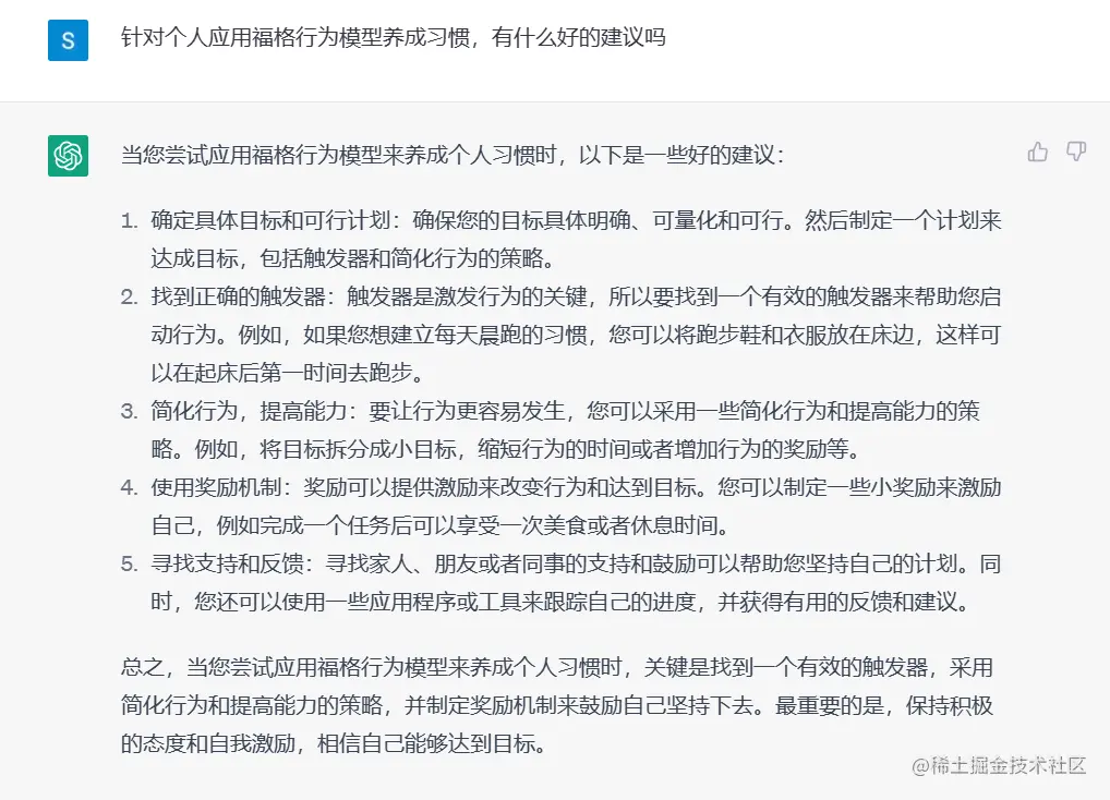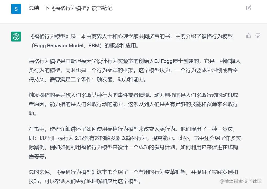 我用ChatGPT写了一篇《福格行为模型》读书笔记帮助你养成习惯 高端码农 2023-04-18 532 阅读1分钟 总的来说,ChatGPT 写的还不错,书中的要点总结的很好。但是一些细节还需要自己看书才能有深刻的体会。其中我感受比较深刻的还是“奖励”。在你完成了一个动作的时候,可以在心里给自己点一个赞,或者默念一句“我真棒”、“这段代码写的真漂亮”。我以前有时候也会这么做,但是直到看到这本书,我才理解了这么做的意义,这个看似不起眼的鼓励,会让你感觉良好,也就更有动力将习惯坚持下去。