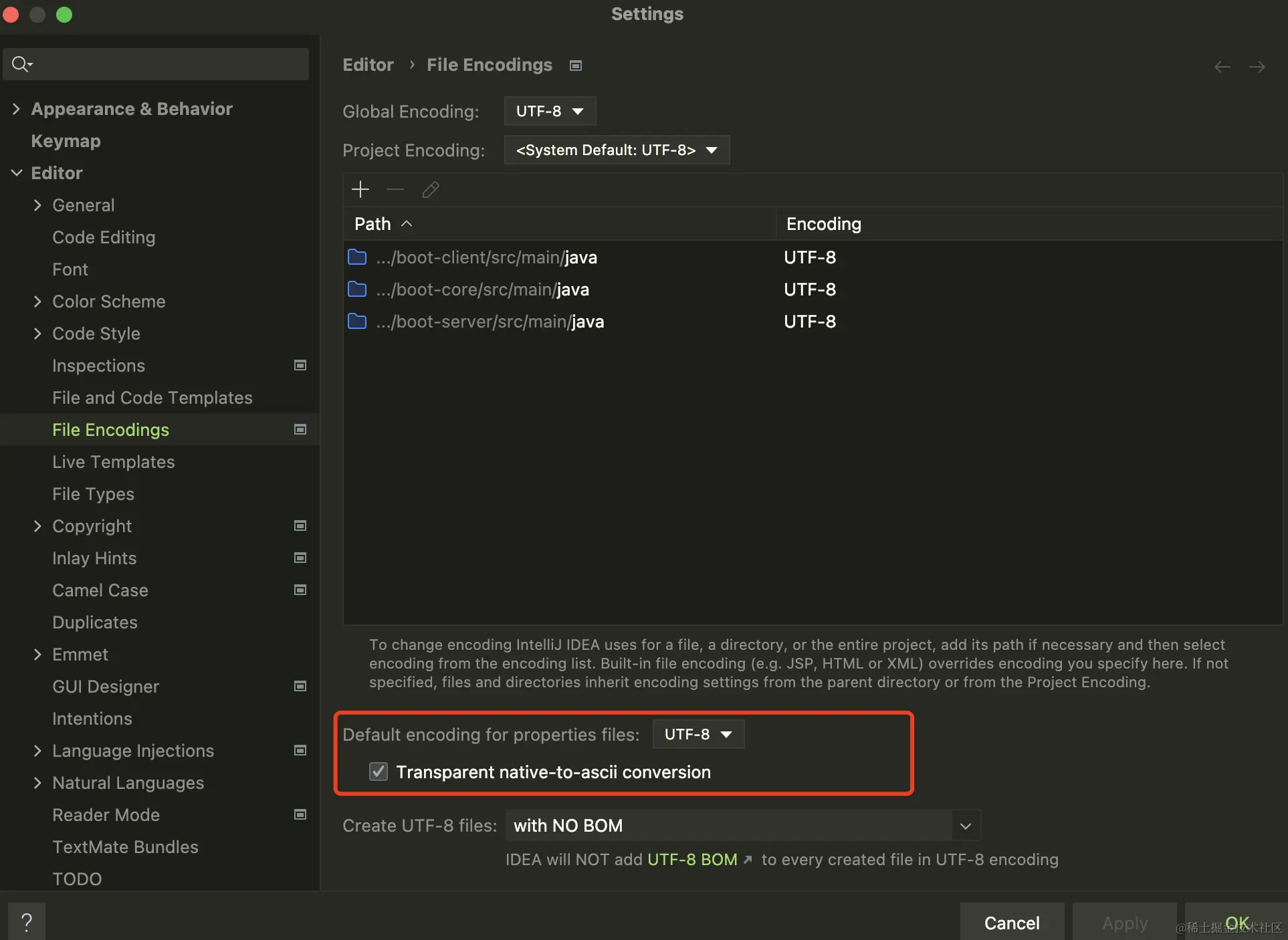在遇到application.properties文件中文乱码时(我使用的idea),需要在idea的setting中修改 Editor -> File Encodings ,做出如下修改: