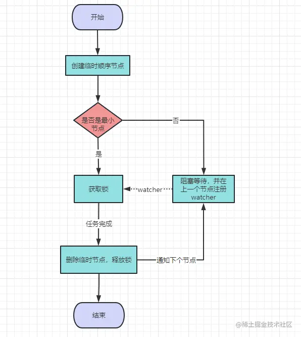 建立子节点之后,对父节点下面所有临时节点进行排序,判断刚创建的临时节点是否是最小的节点,如果是最小的节点,就获取锁。如果不最小的节点,则等待锁,并且获取该节点上一个顺序节点,并为其注册监听事件,等待触发事件并获得锁。
