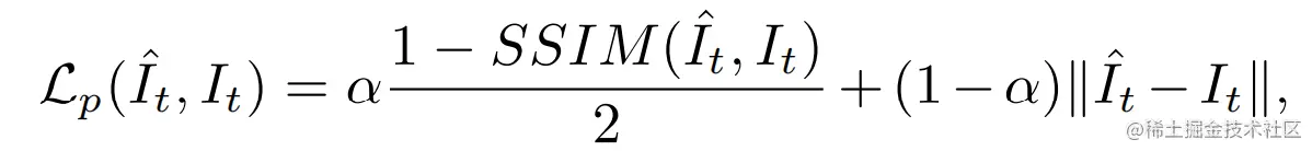 上面公式相当于两个相机坐标系下的转换,即源图像(一般为前后帧)先用内参的逆转换到它的相机坐标系,再用旋转平移矩阵转到目标图像相机坐标系,再用内参转到目标图像的图像坐标系得到重构的目标图像,计算目标图像和重构目标图像之间的损失: