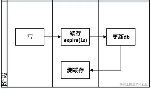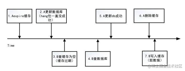 本策略中步骤1为expire缓存,不会发生击穿缓存到数据库的情况,数据将直接返回。除非更极端情况,如下图: