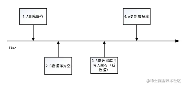 1)此时缓存刚好失效 2)A查库得到旧值 3)B更新DB成功