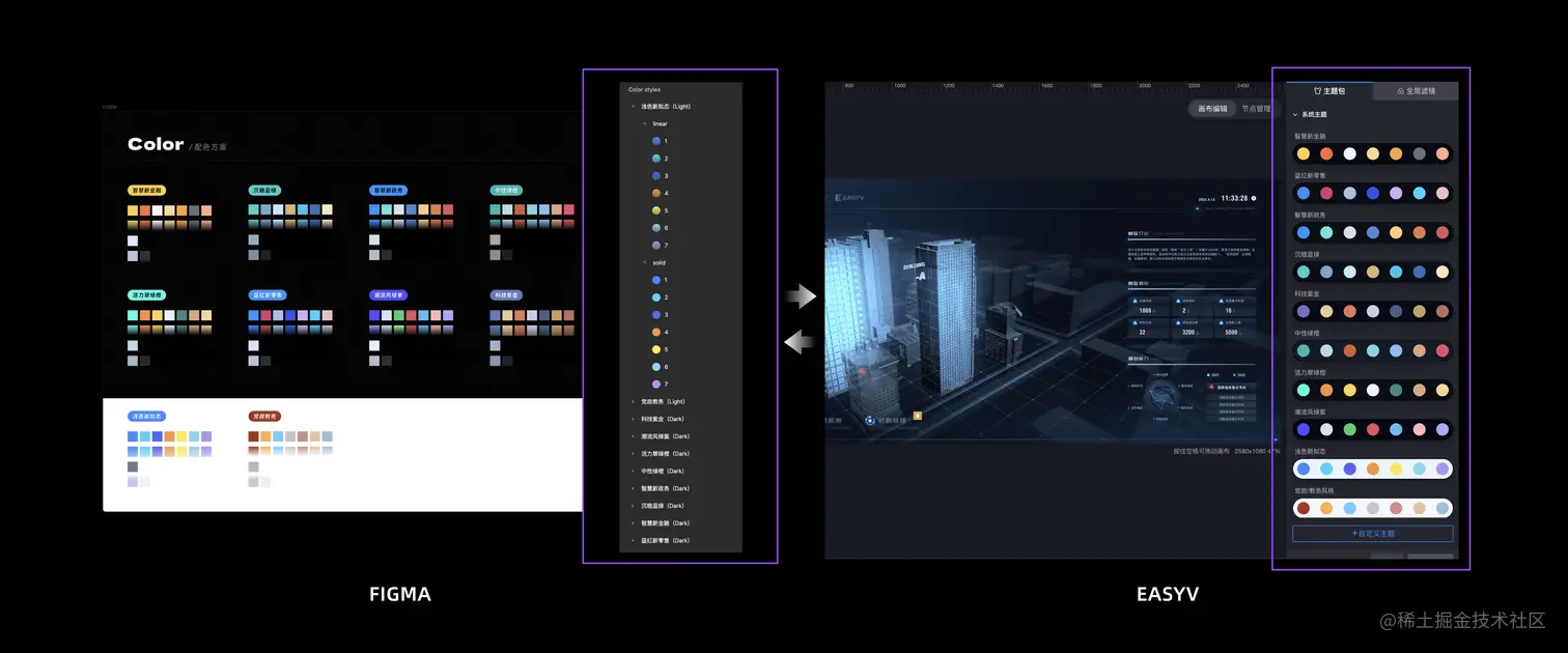 色彩作为突出重点、区分数据类别、传达情感和引导观众注意力的部分,我们内置了可视化设计VED团队自有的设计作品中十套满足常用场景的配色方案,与EasyV中的主题配色一一对应。