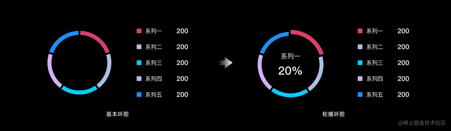 - 基本饼图、多色玫瑰饼图、基本环图、轮播环图一键切换