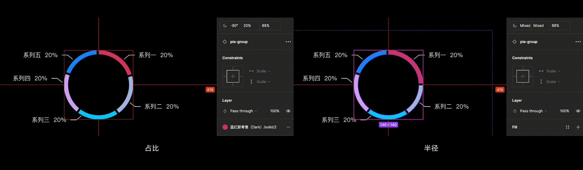 - 由于没有更多辅助信息帮助数据表达,饼图、环图的图例相较于轴类的图例被寄予了更高的期望;除了图标与类目文本外,供给使用者是否显示类目对应的占比以及实际数值情况,其约束方式最大程度上保障图表元素间的平衡,若整体拖拽比例较大时,需要手动校准;