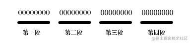 要了解这些知识和掌握计算方法,你得有一定的基础知识,至少你应该明白,IP地址是由32位二进制数据来表示的,每8位表示一段,共有四段,如下图。四段自然就是4×8=32位了。