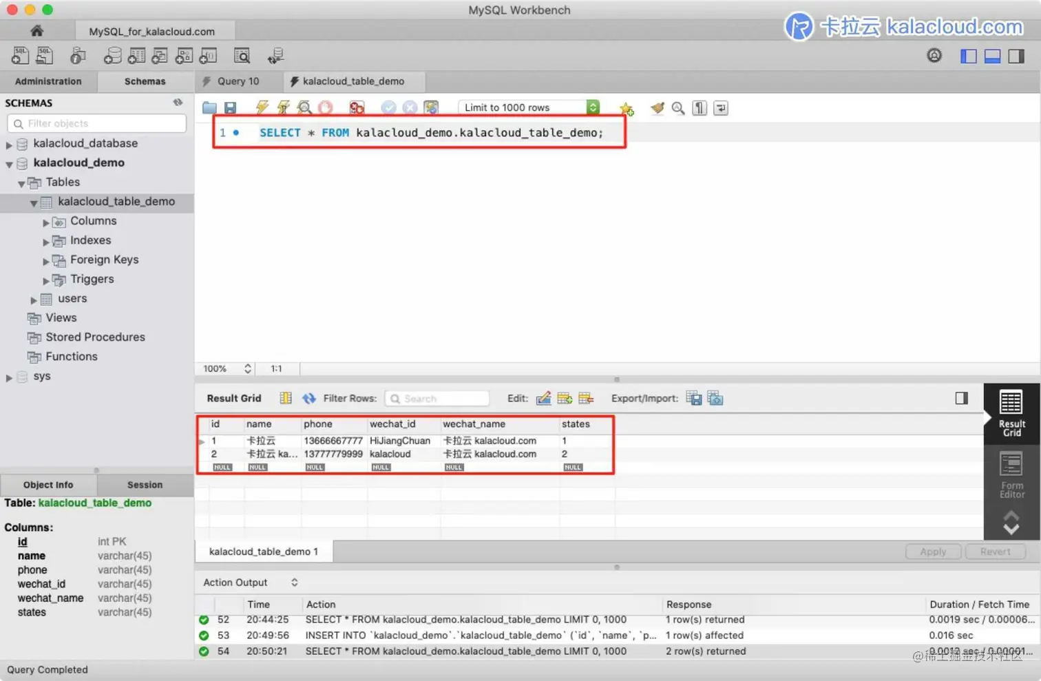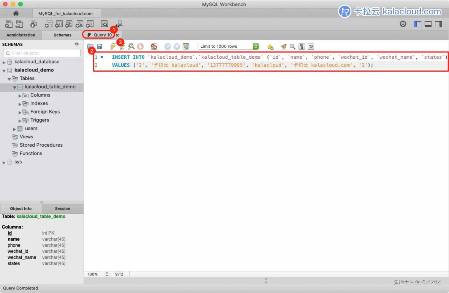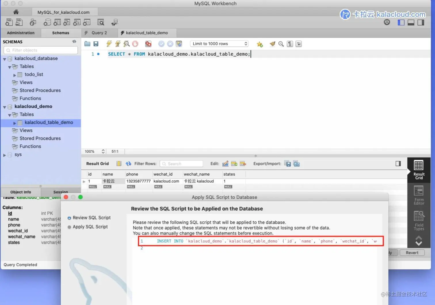我们也可以直接在 Workbench 执行一段 SQL 查询,下面这段代码是向kalacloud_demo数据库中kalacloud_table_demo表里插入一行数据。