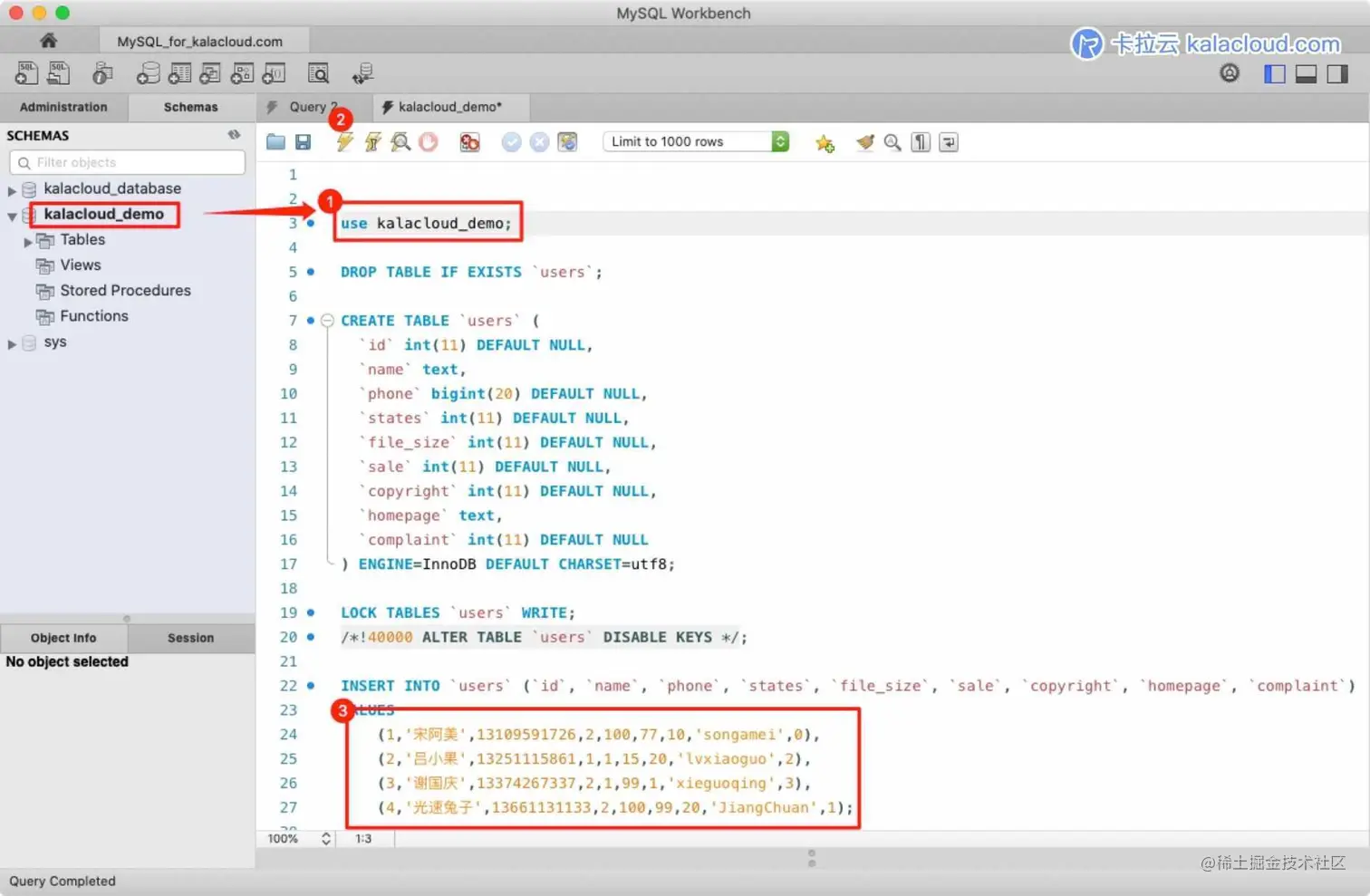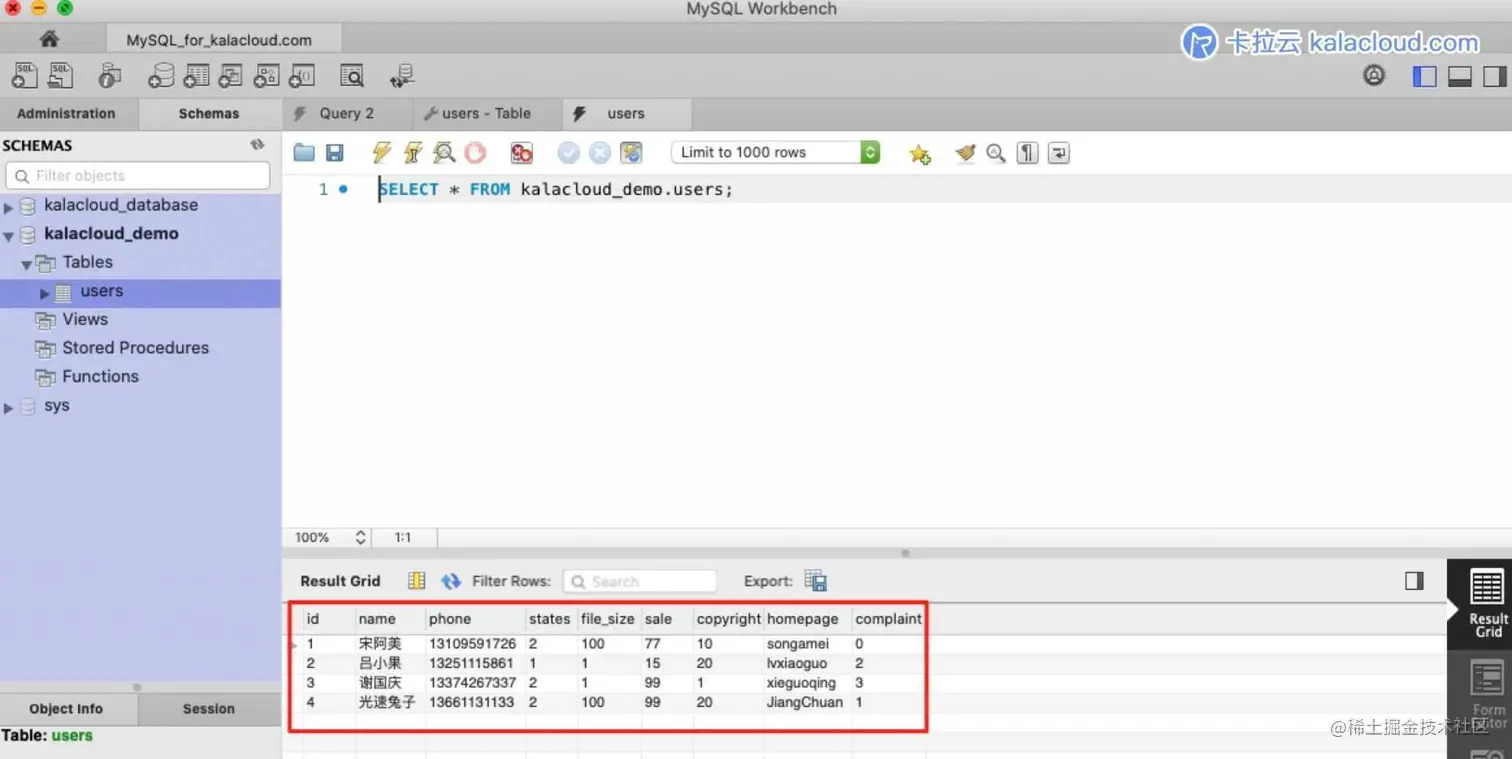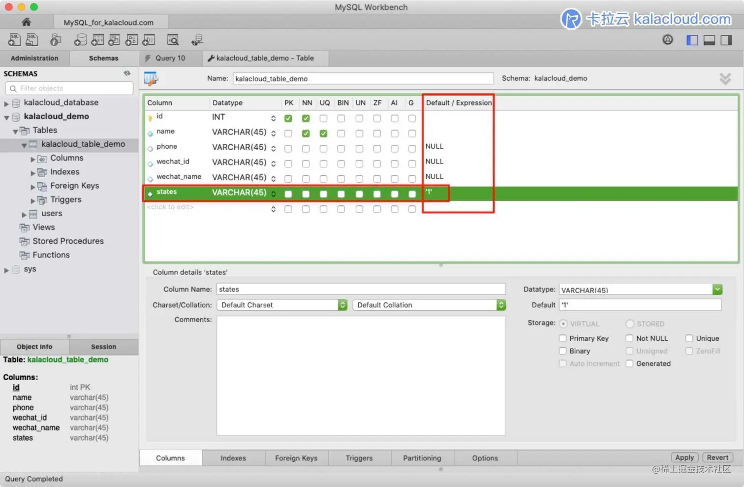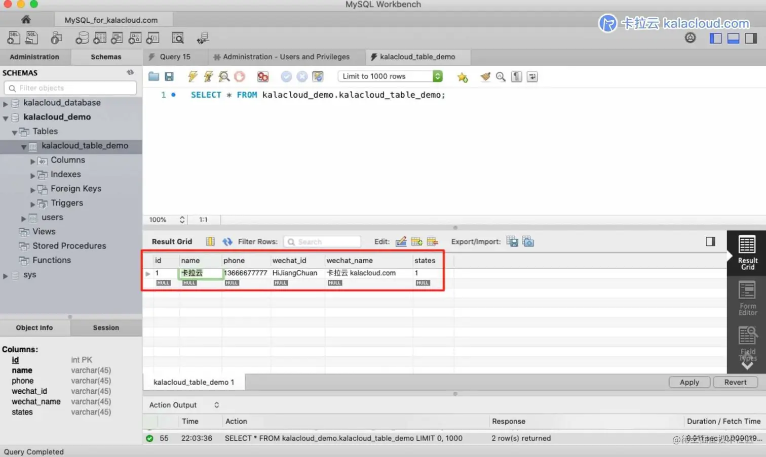 我们也可以直接在 Workbench 执行一段 SQL 查询,下面这段代码是向kalacloud_demo数据库中kalacloud_table_demo表里插入一行数据。