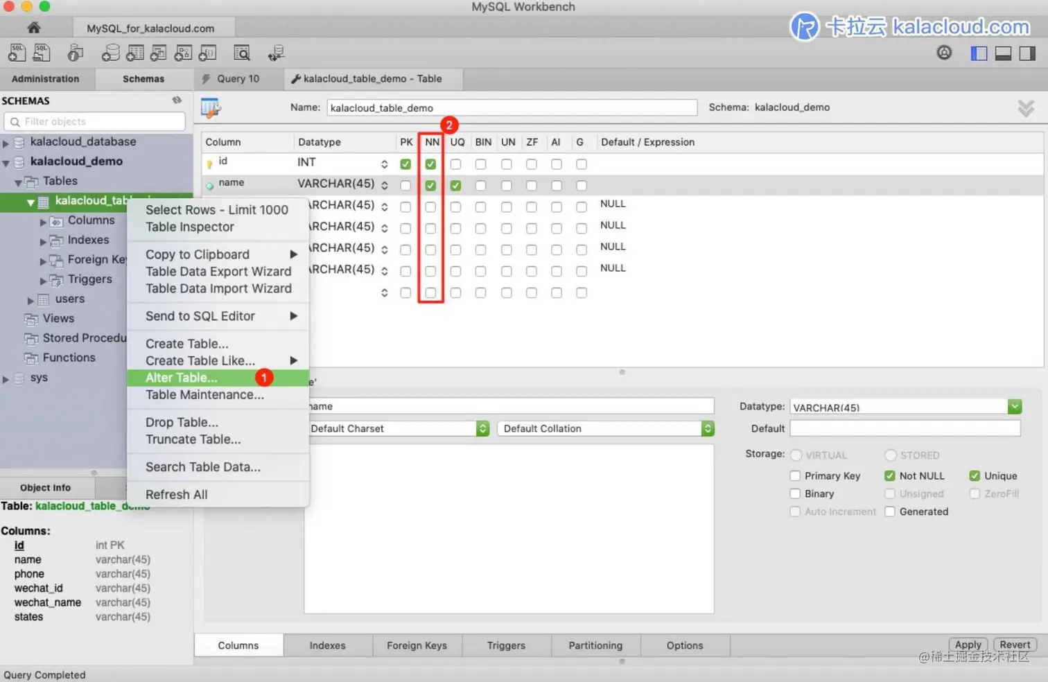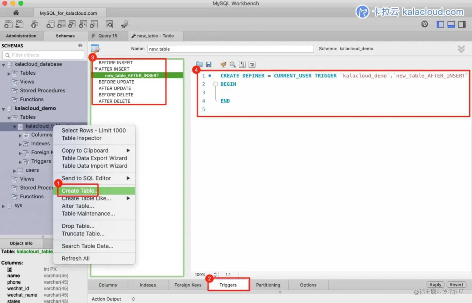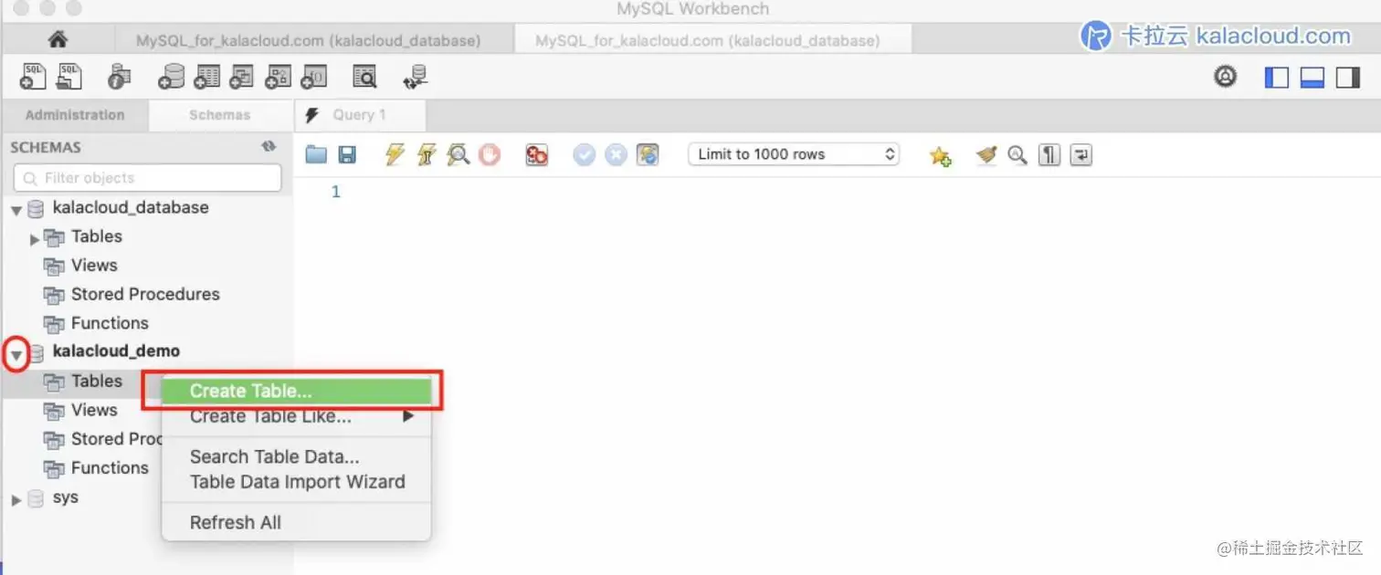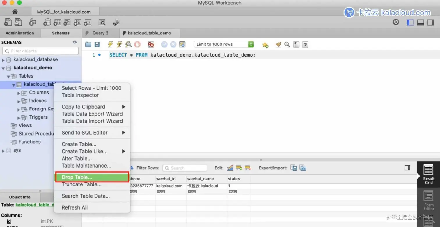 右键点击kalacloud_demo ,选择 Set as Default Schema 先把它设置成默认数据库。