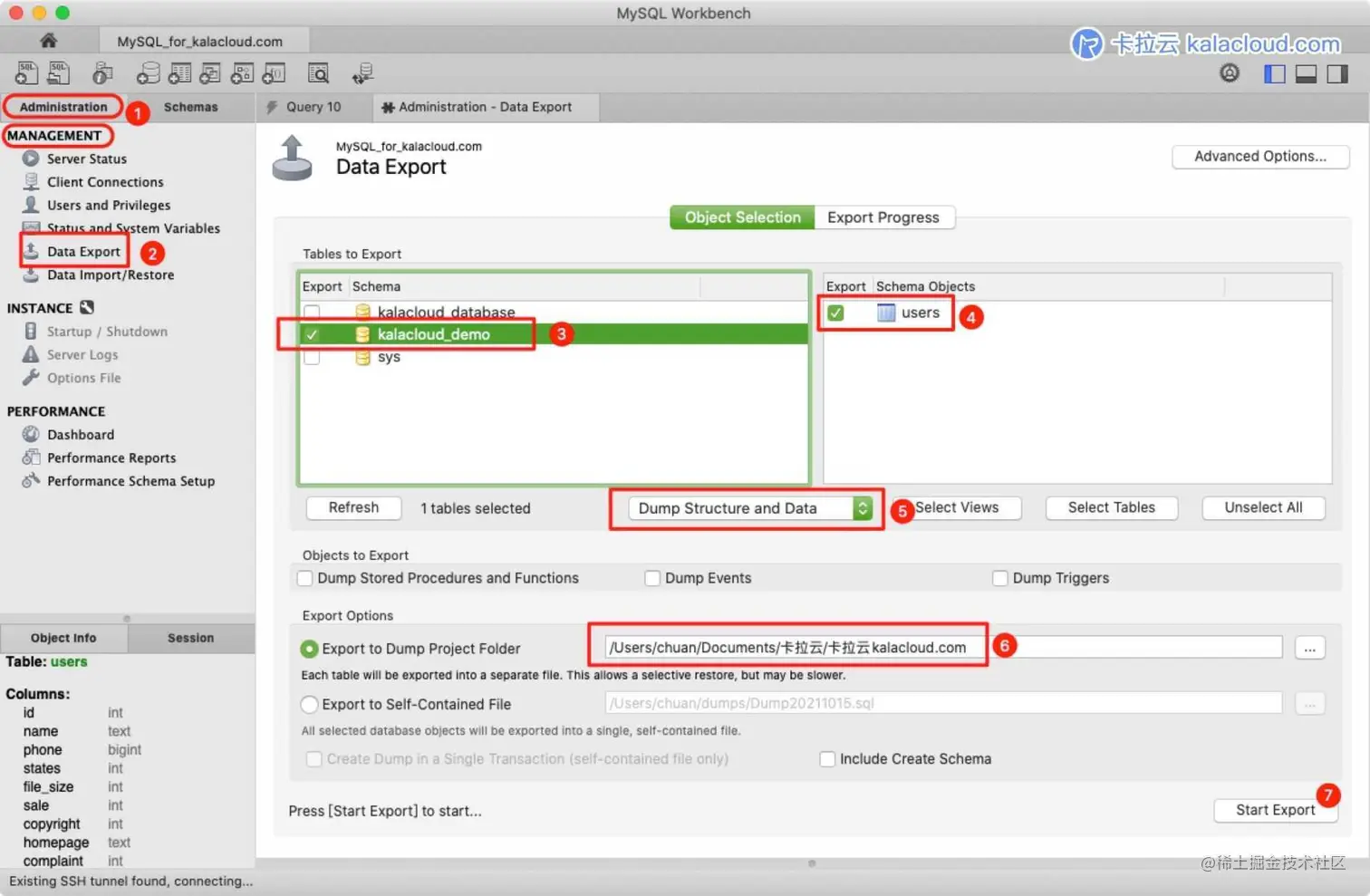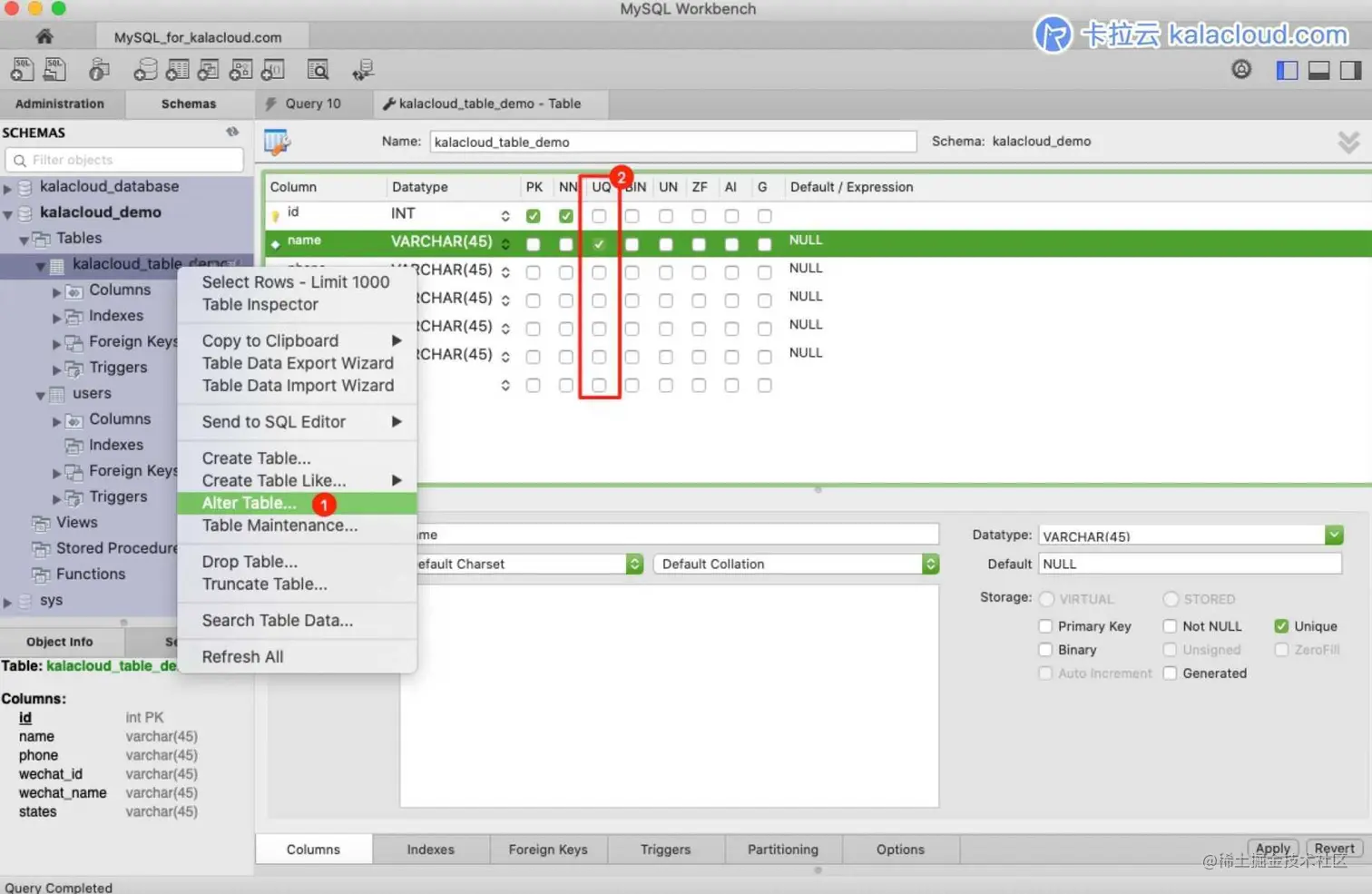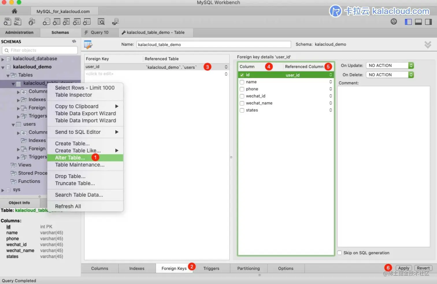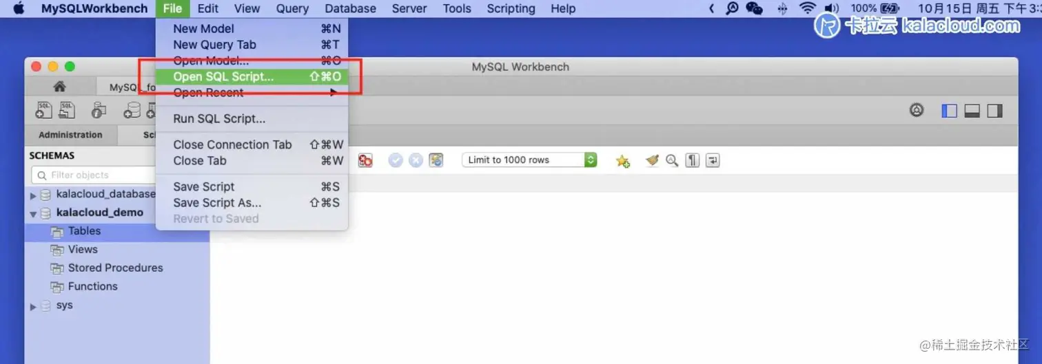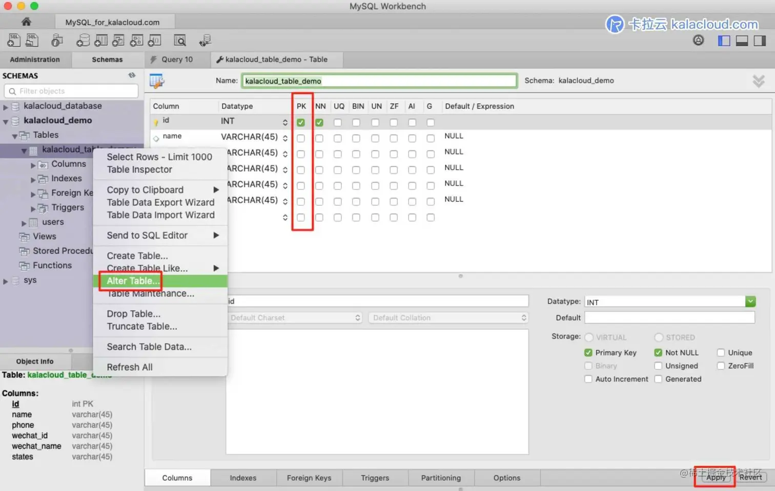 右键点击kalacloud_demo ,选择 Set as Default Schema 先把它设置成默认数据库。