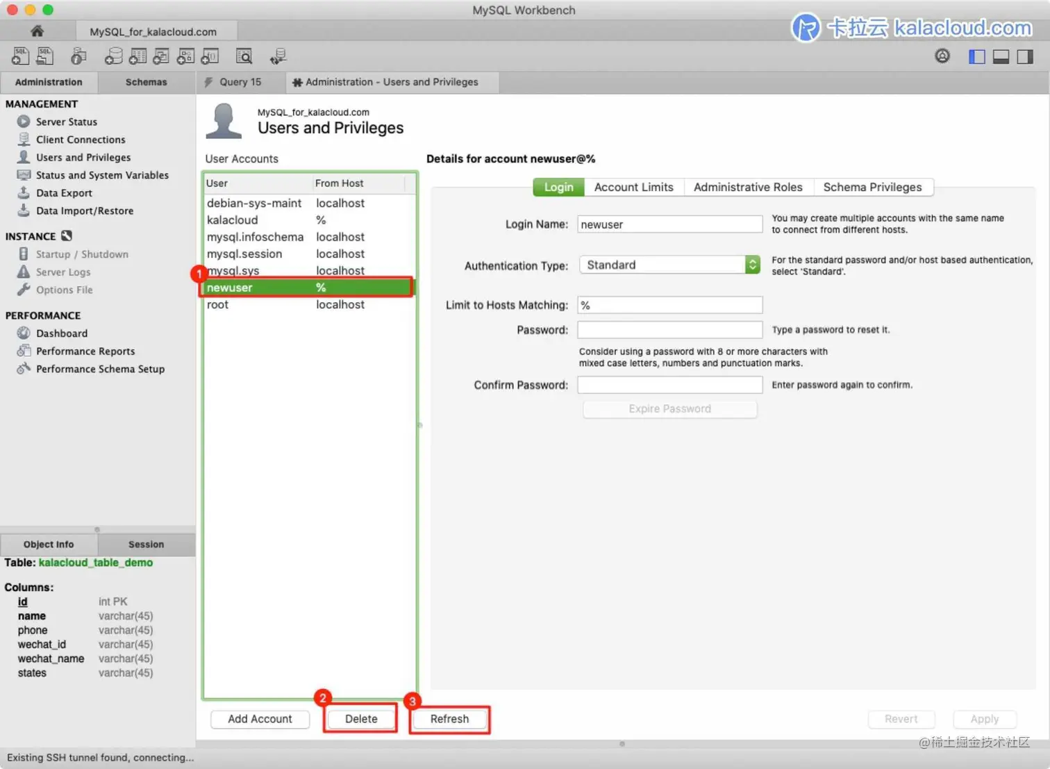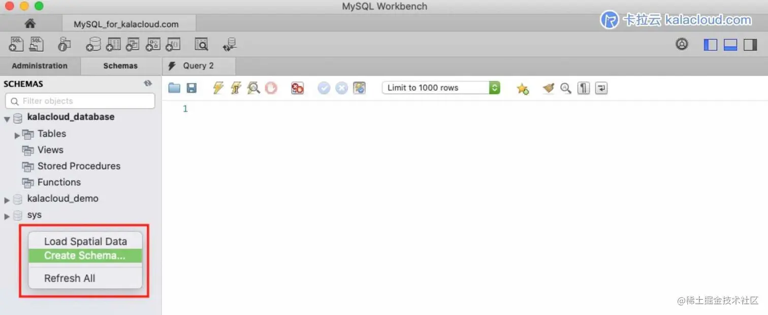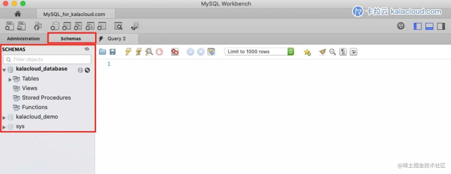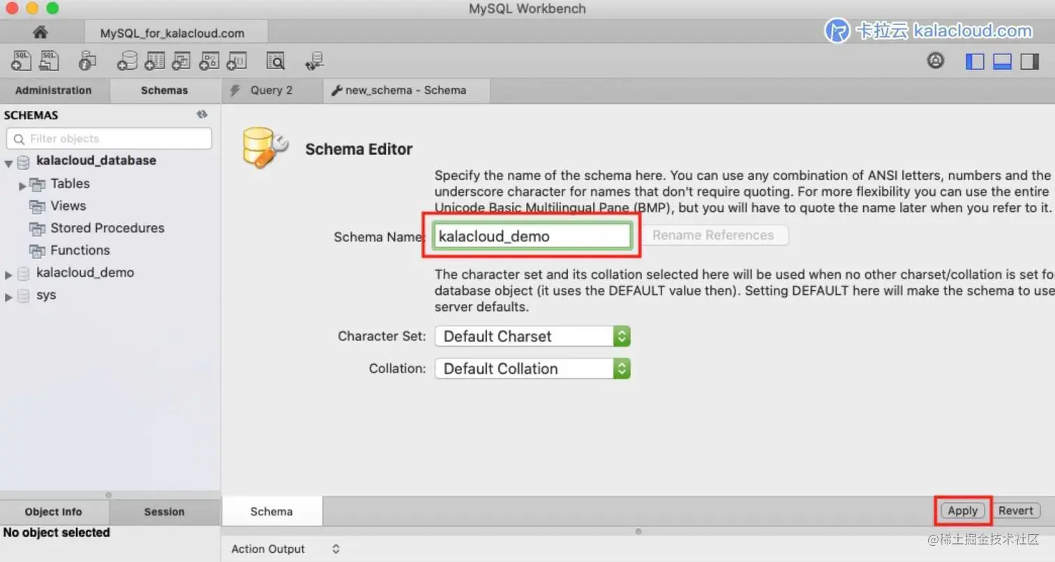执行命令,创建成功。可以看到 Schemas 列表中多了我们刚刚创建的 kalacloud_demo 数据库