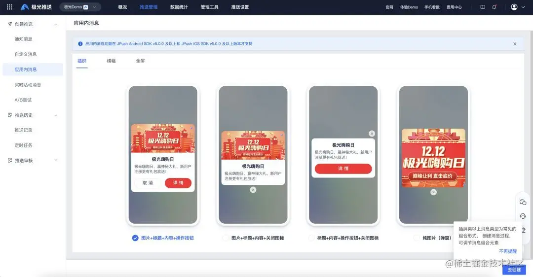 极光推送应用内消息提供了“插屏”、“横幅”、“全屏”三类样式模板供选择(可选任意一类模板然后自定义样式,进行消息创建);