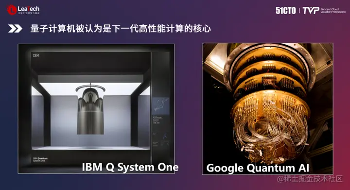 IBM 和谷歌在这方面研究比较早,下面的图片是量子计算其中的一种技术路线,叫超导量子,其芯片是会放在类似于吊灯最下面,上面的线束都是它的操控系统和制冷系统,它会成为高性能计算下一代的计算核心。