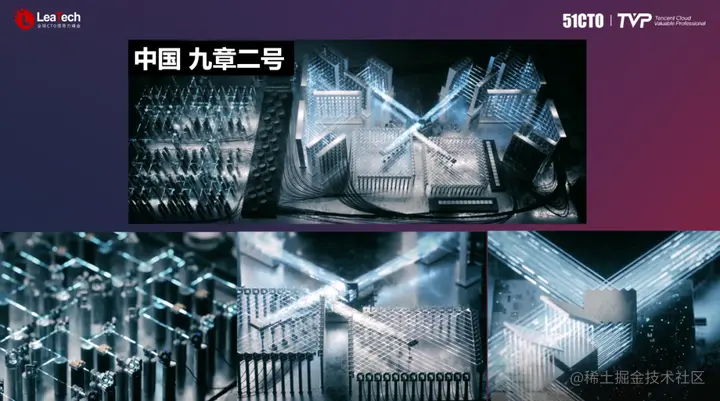 在国内,我们是完全不同的量子计算机形态,下图是中科院研发的九章——光量子计算机,形态跟刚才见到的吊灯是完全不一样的,原因在于它用的是光量子,产生量子比特的方式是不一样的,自然形态不同。