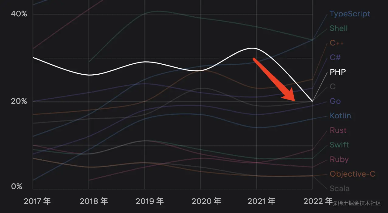 世界上最好的语言 PHP 有明显下降的趋势,如果你还年轻。建议尽快上手第二门编程语言。