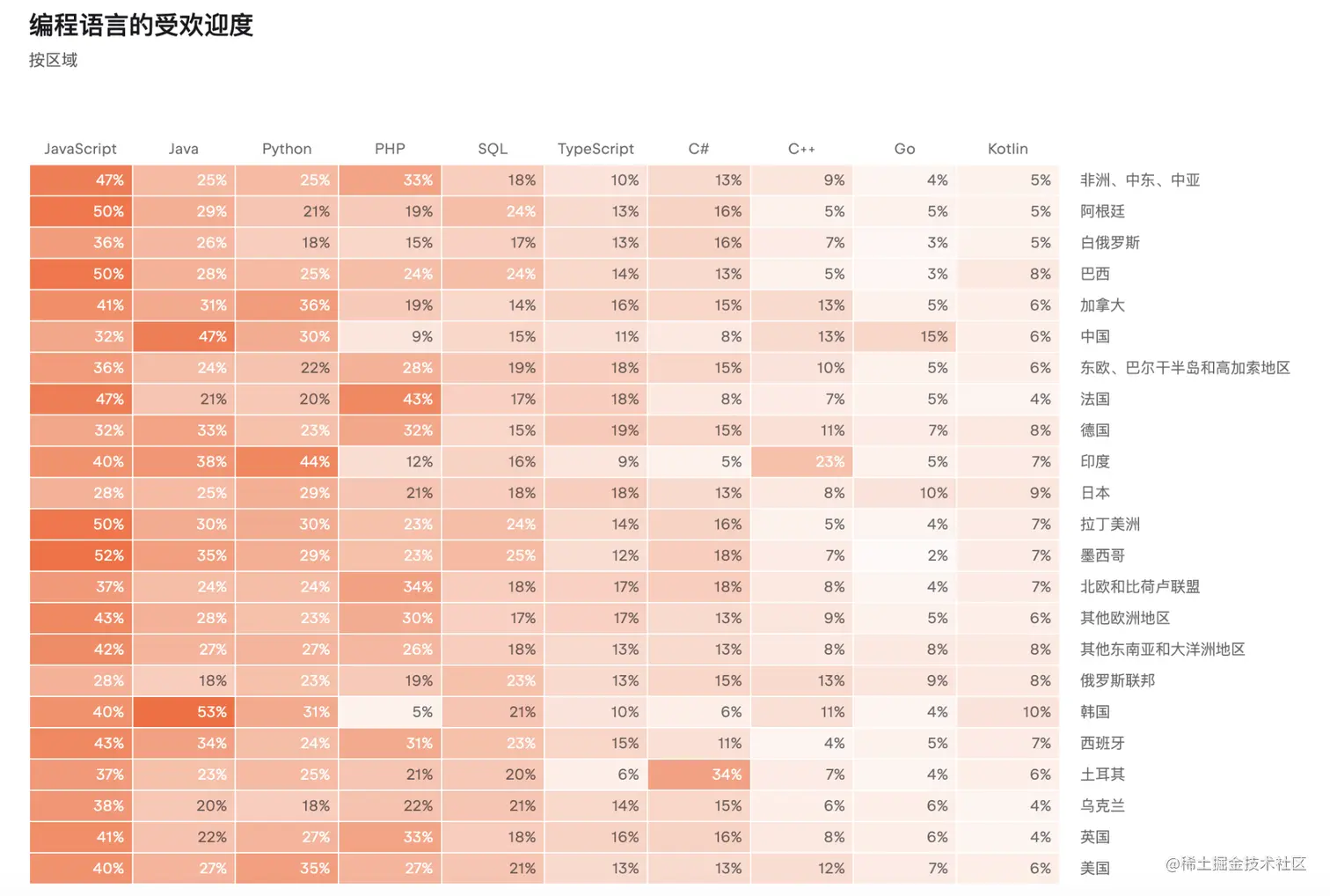 - 最受欢迎和最不受欢迎的语言:JavaScript 和 Java 均名列前茅。