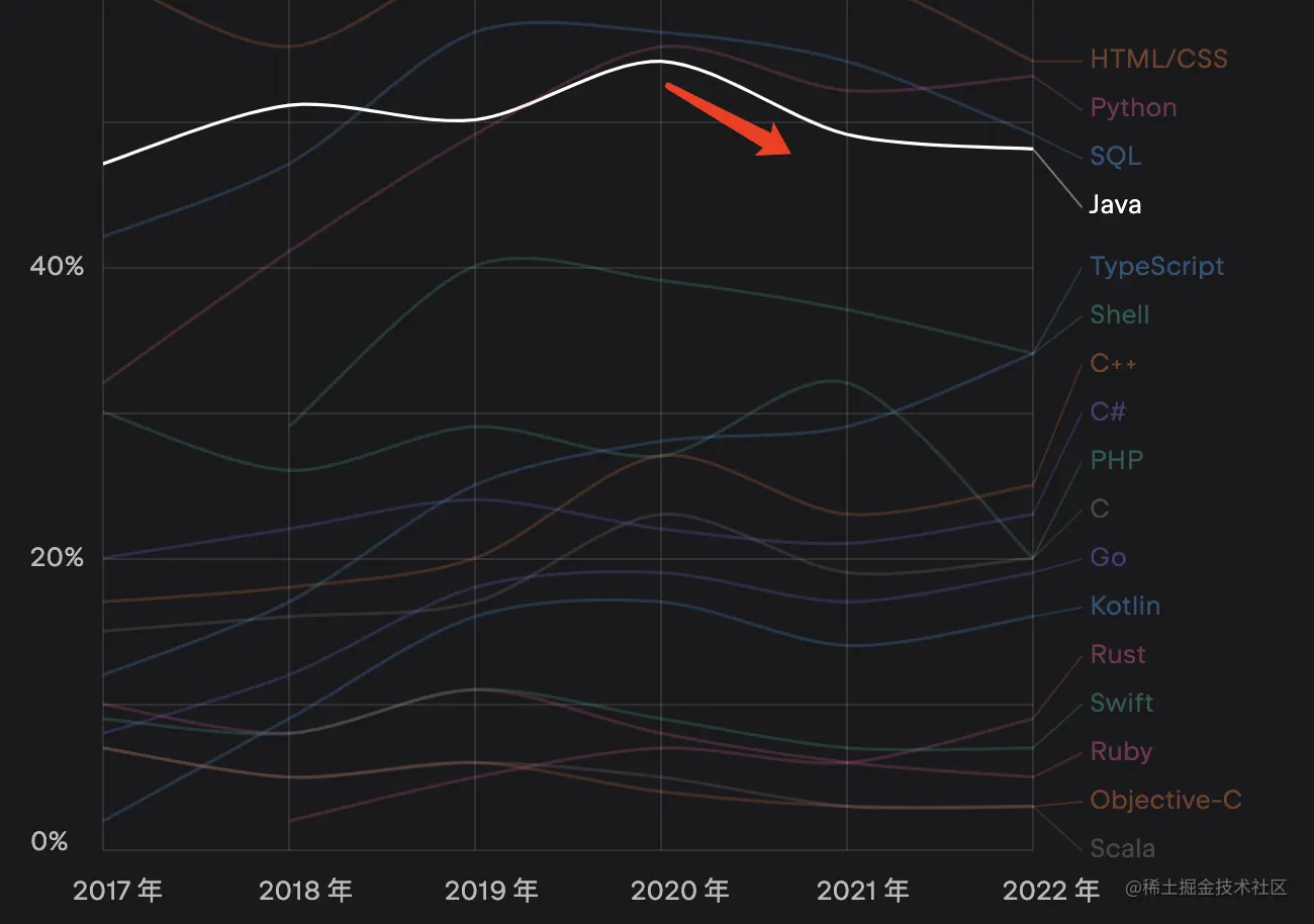 - 自 2020 年起,Java 的使用人群比例有所下滑,感觉是天花板到顶了,转平滑稳定增长了。