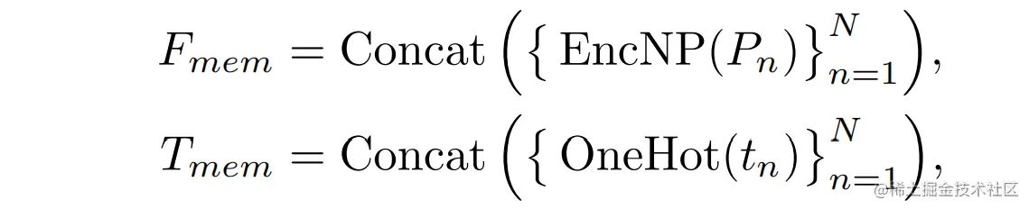 point memory由一个feature memory 和一个label memory 。以图像分类任务为例,假设给定的训练集包含K个类别的N个点云,。通过上述非参数编码器得到的N个全局特征进行编码,同时将它们的ground-truth标签转换为一个one-hot编码。然后分别将两者沿着样本维度concat,缓存为两个矩阵: