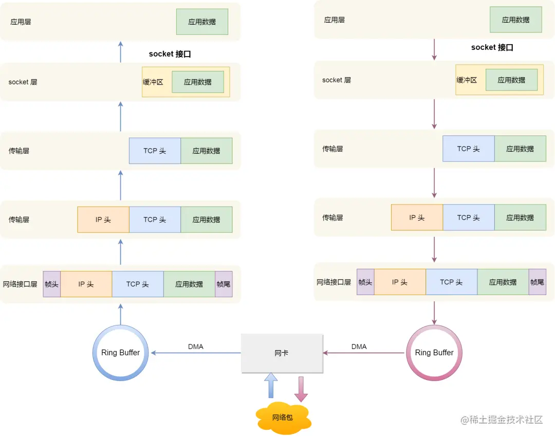 - 应用程序会调用 Socket 发送数据包的接口,由于这个是系统调用,所以会从用户态陷入到内核态中的 Socket 层,Socket 层会将应用层数据拷贝到 Socket 发送缓冲区中。