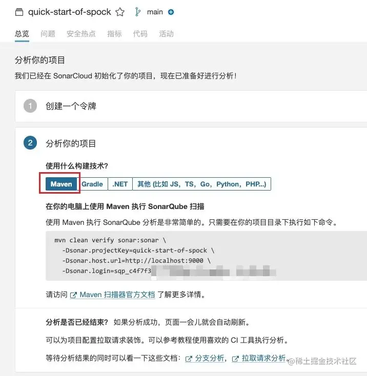 接着,我们选择 Maven 构建技术,随后 SonarQube 会自动为我们生成对应的命令,如下图所示。