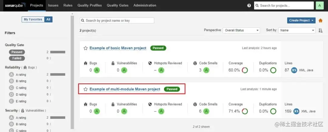 此时再打开 SonarQube 管理后台,可以看到多了一个名为 maven-multimodule 的项目,如下图所示。