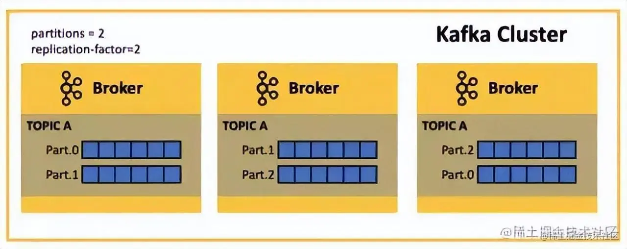Broker 的可靠性需要依赖其多副本机制: 一般副本数 3 个(配置参数:replication.factor=3)