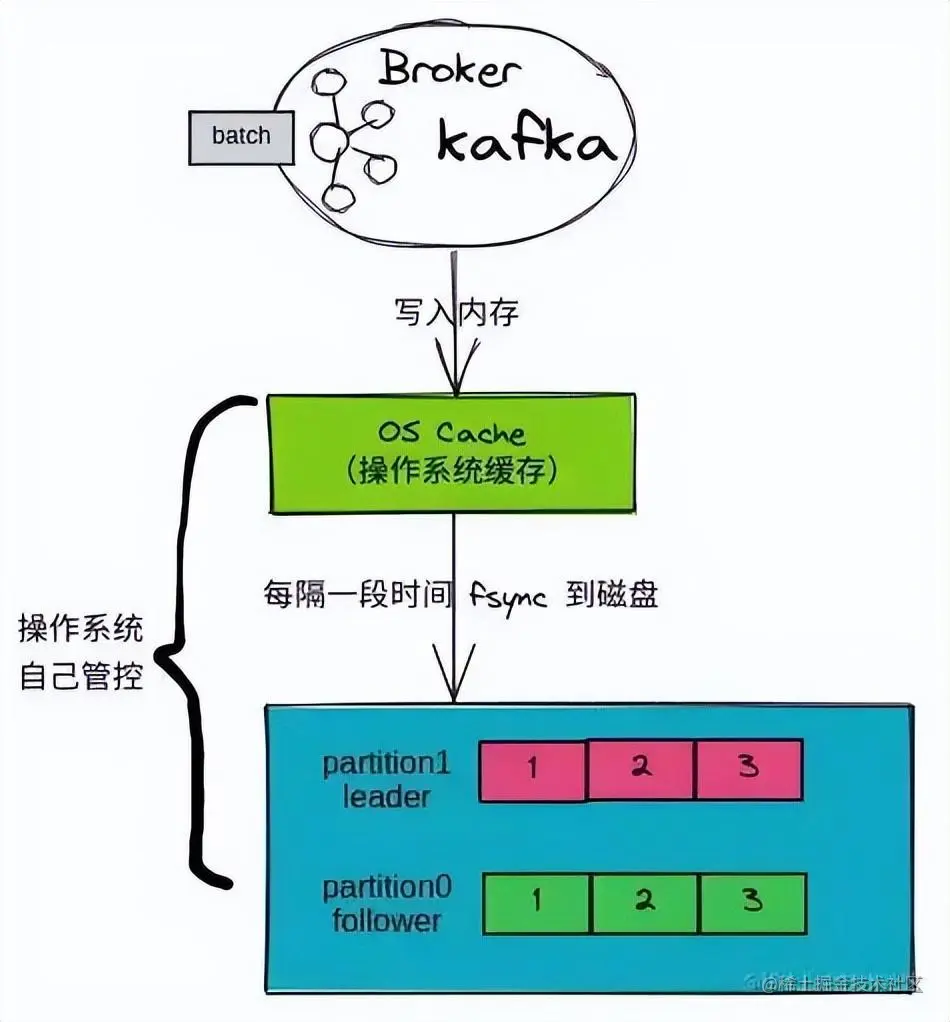 Broker 接收到一批数据,会先写入内存 PageCache(OS Cache)中。