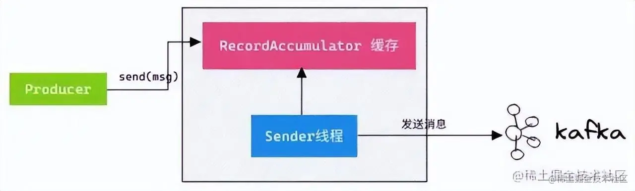 调用 send() 方法时,不会立刻把消息发送出去,而是缓存起来,选择恰当时机把缓存里的消息划分成一批数据,通过 Sender 线程按批次发送给服务端 Broker。