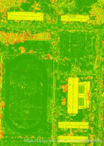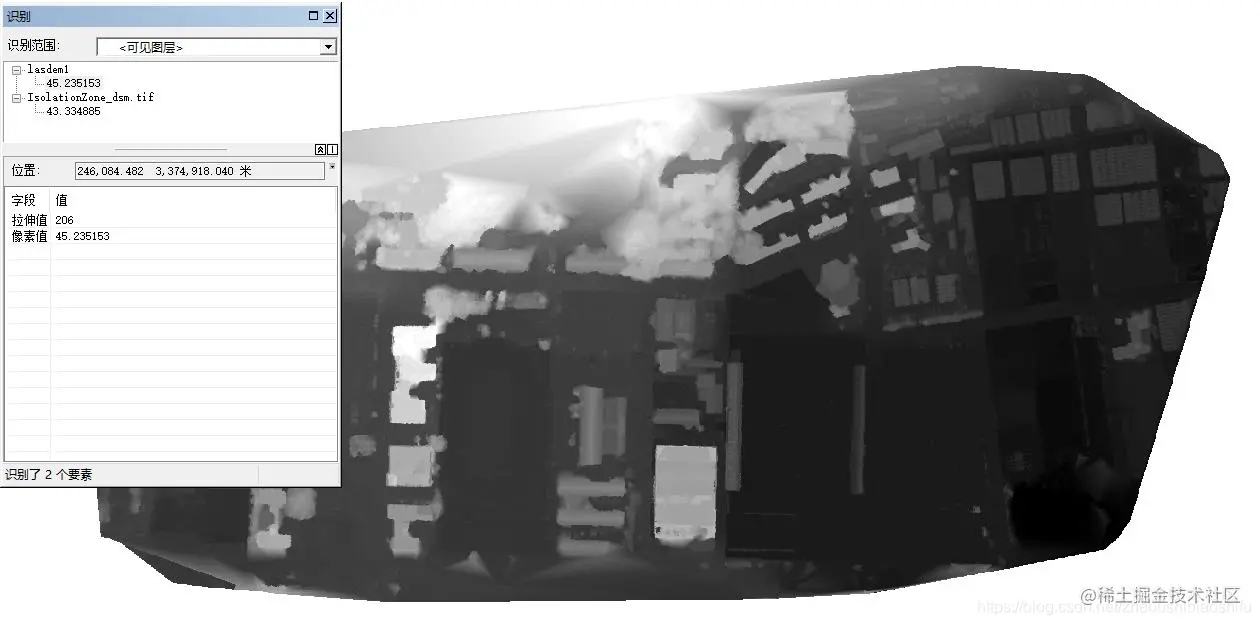 基于上述分析,个人决定还是需要直接由海拔高度入手,选取一个对研究区域DSM数据中建筑物与地表高度具有较好区分度的海拔数值,并以其作为建筑物与地表的分割阈值。经过多次尝试,发现这一阈值选取为20 m时整体较为合适。