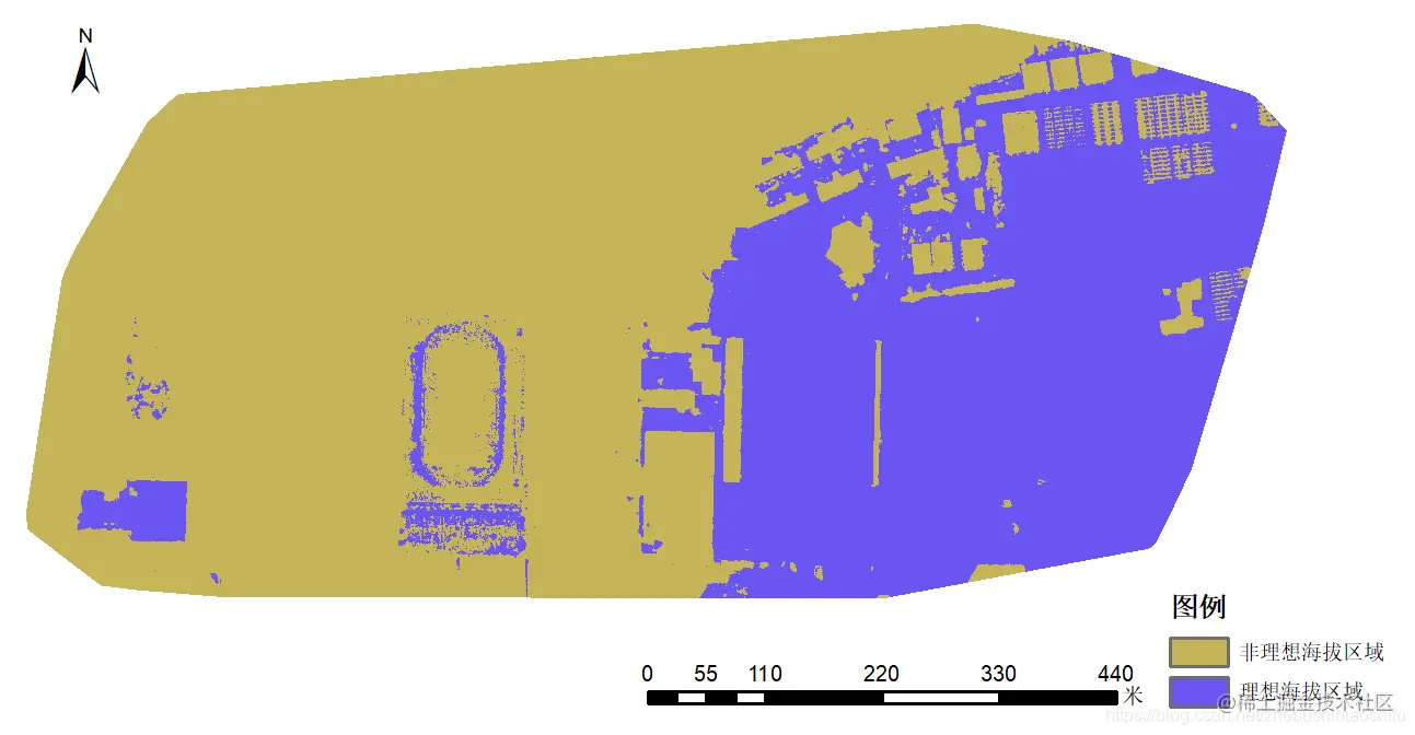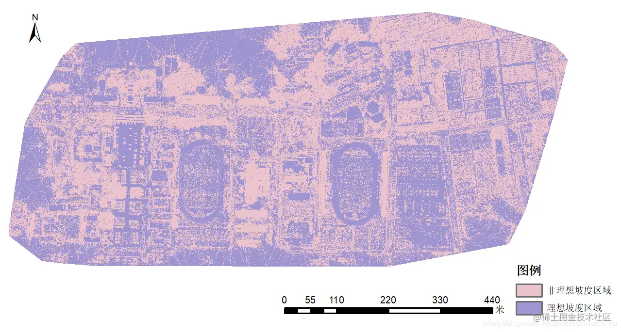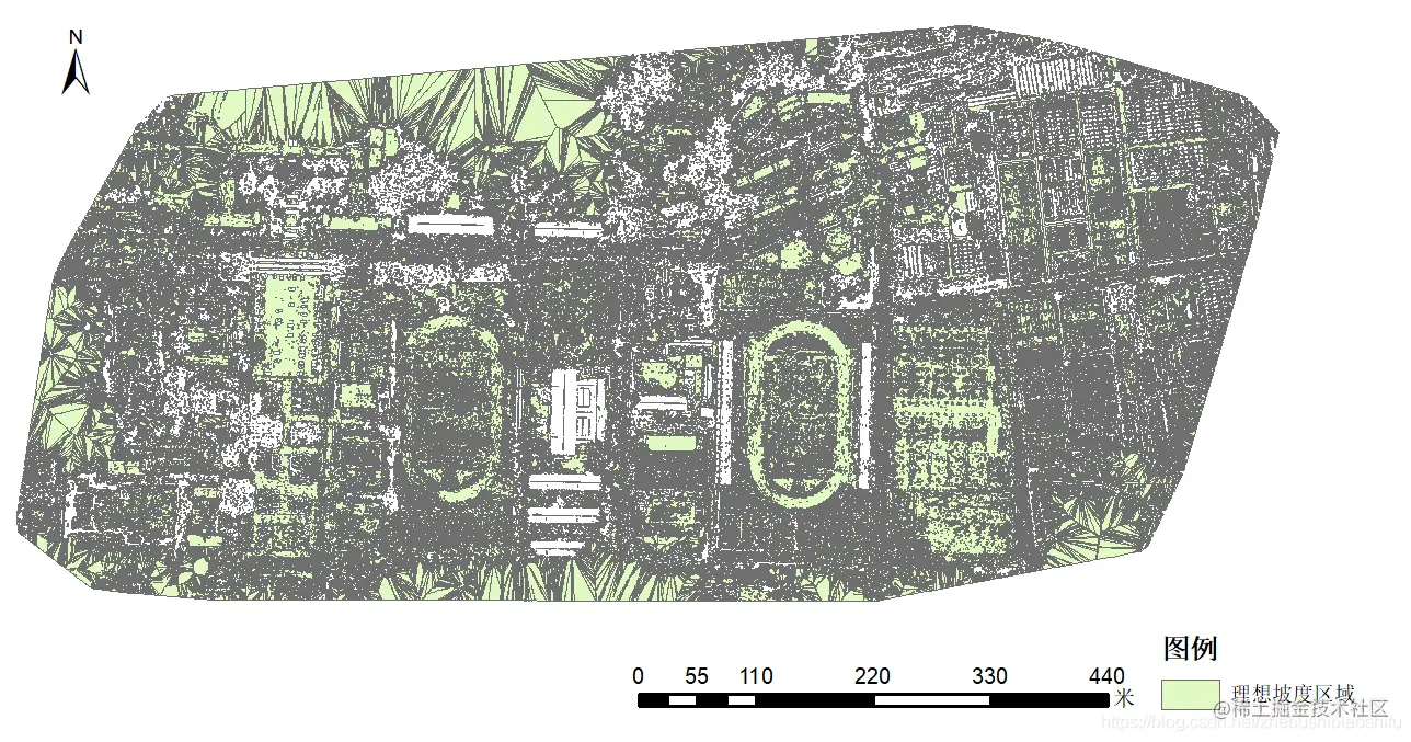 下图为同时满足坡度要求与临近地物要求(距离20 m以上建筑物15 m以上)的区域。