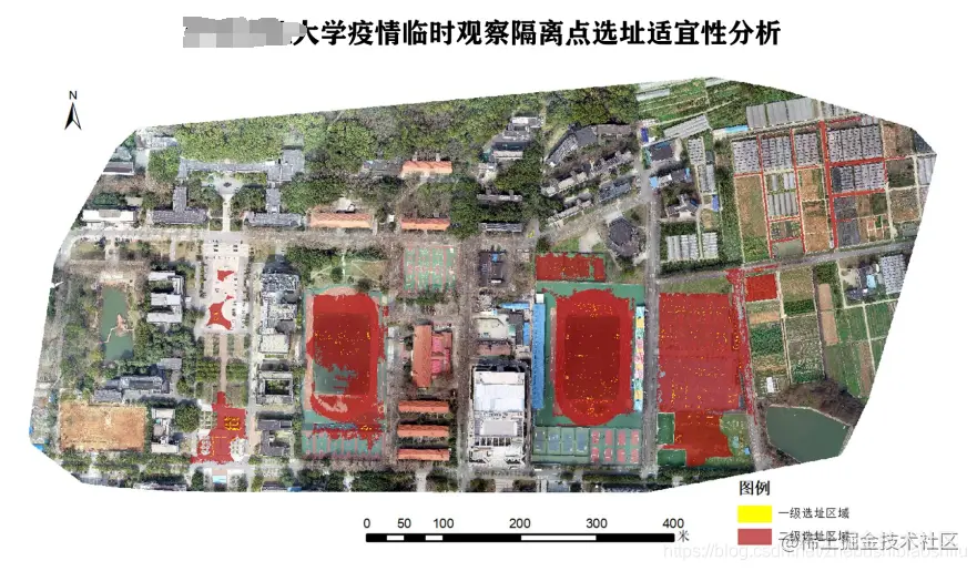 与前述基本约束条件所得选址结果结合,得到具有适宜性评价的该学校疫情临时观察隔离选址分析图,如下图所示。