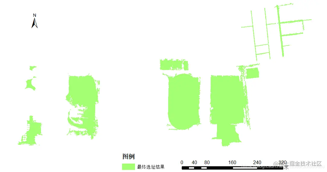 其中,绿色区域即为结合了坡度要求、临近地物要求、防洪能力要求与面积要求的选址结果。