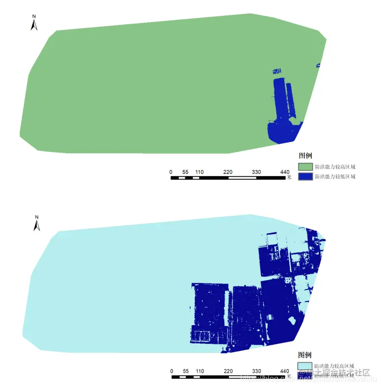 分别以8 m与10 m水位作为阈值,利用同样的方法对研究区域防洪能力加以区分,所得结果如下图所示。