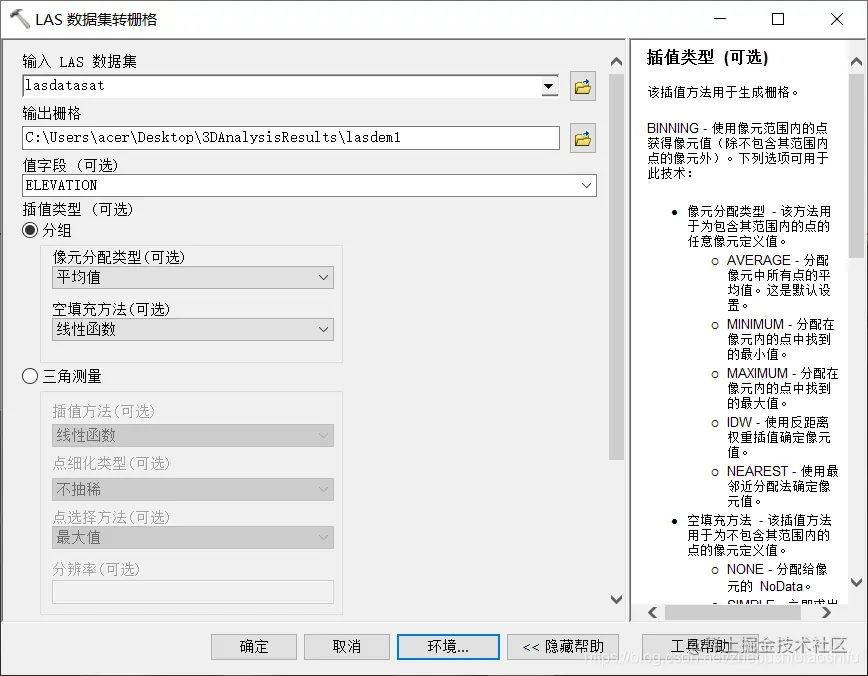 依据网络资源所述,选用“平均值”像元分配类型方法,将LAS数据集转换为栅格,即可得到研究区域的地表平均海拔。借助相关教程,实现这一步骤,如下图所示。