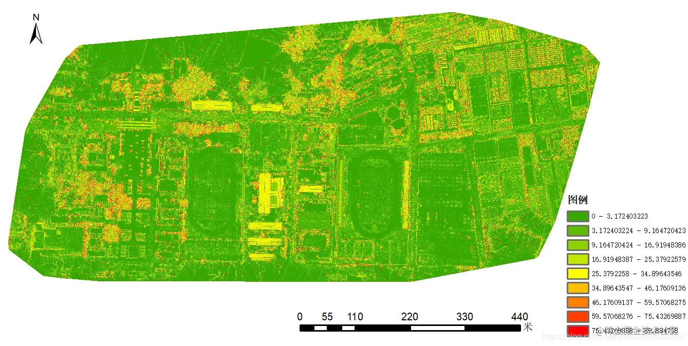 利用三维建模所得部分校园区域DSM数据,求取其坡度信息,如下图所示。
