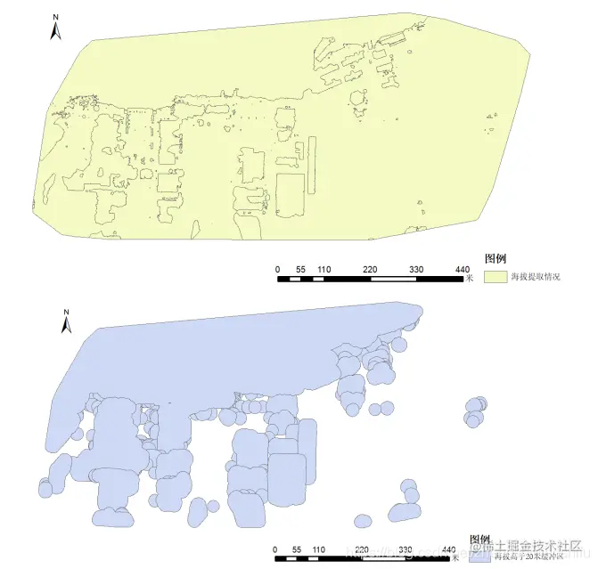 对上述海拔提取结果转变为矢量图层,并以15 m为半径进行缓冲区分析,得到结果如以下三幅图所示。